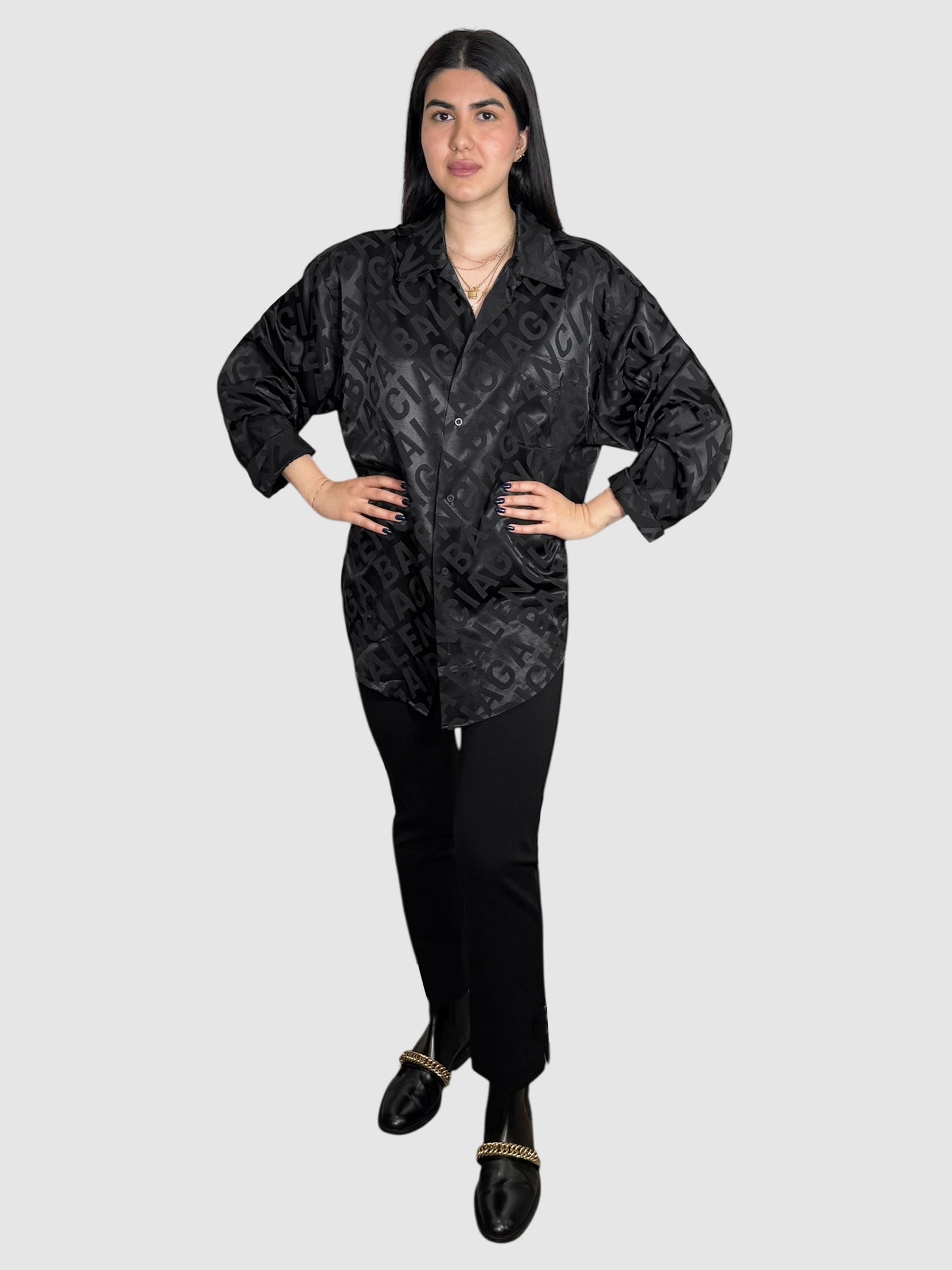 Balenciaga Homewear 2022 Black Logo Satin Button-Up Top, Size 34.