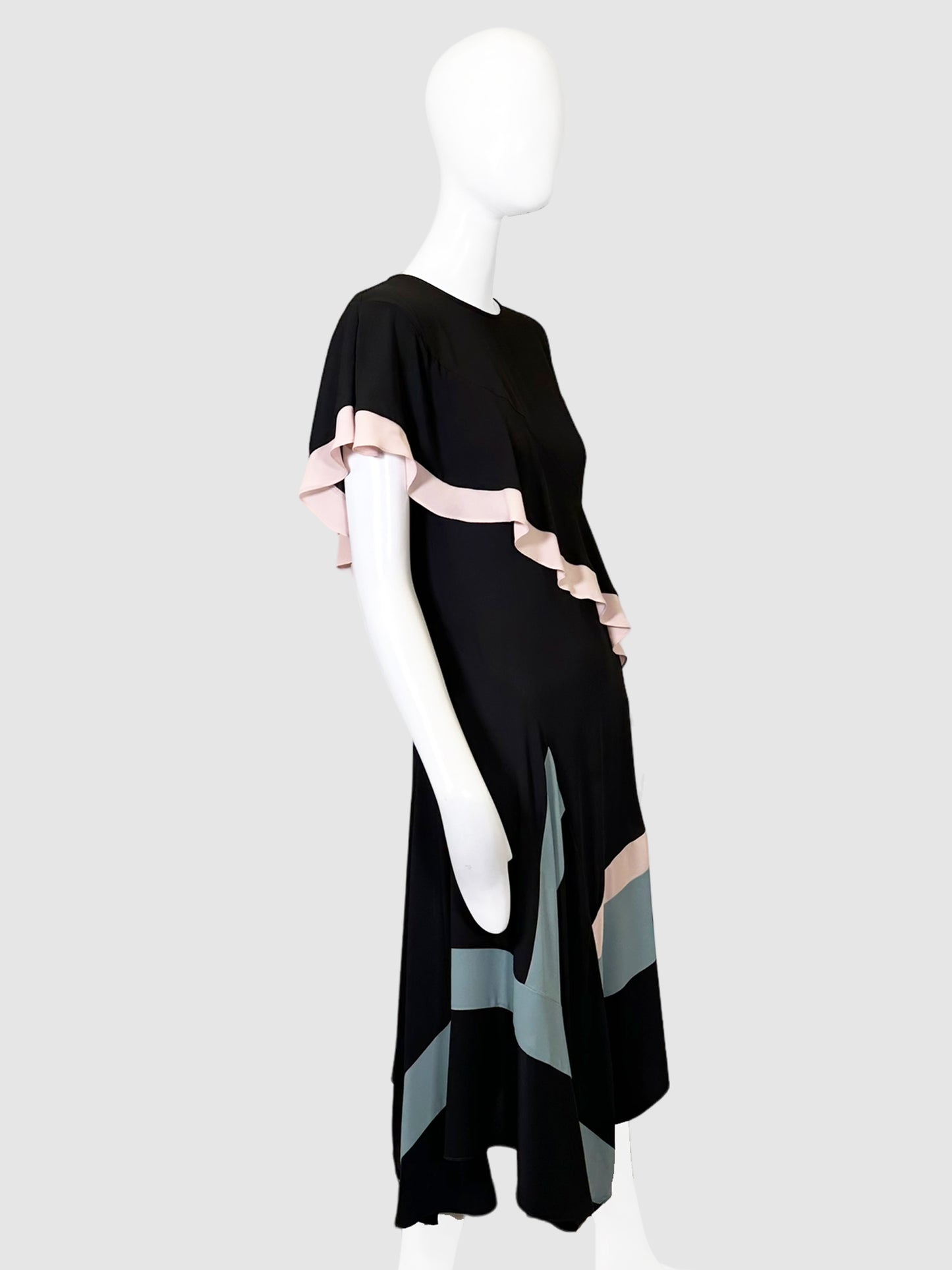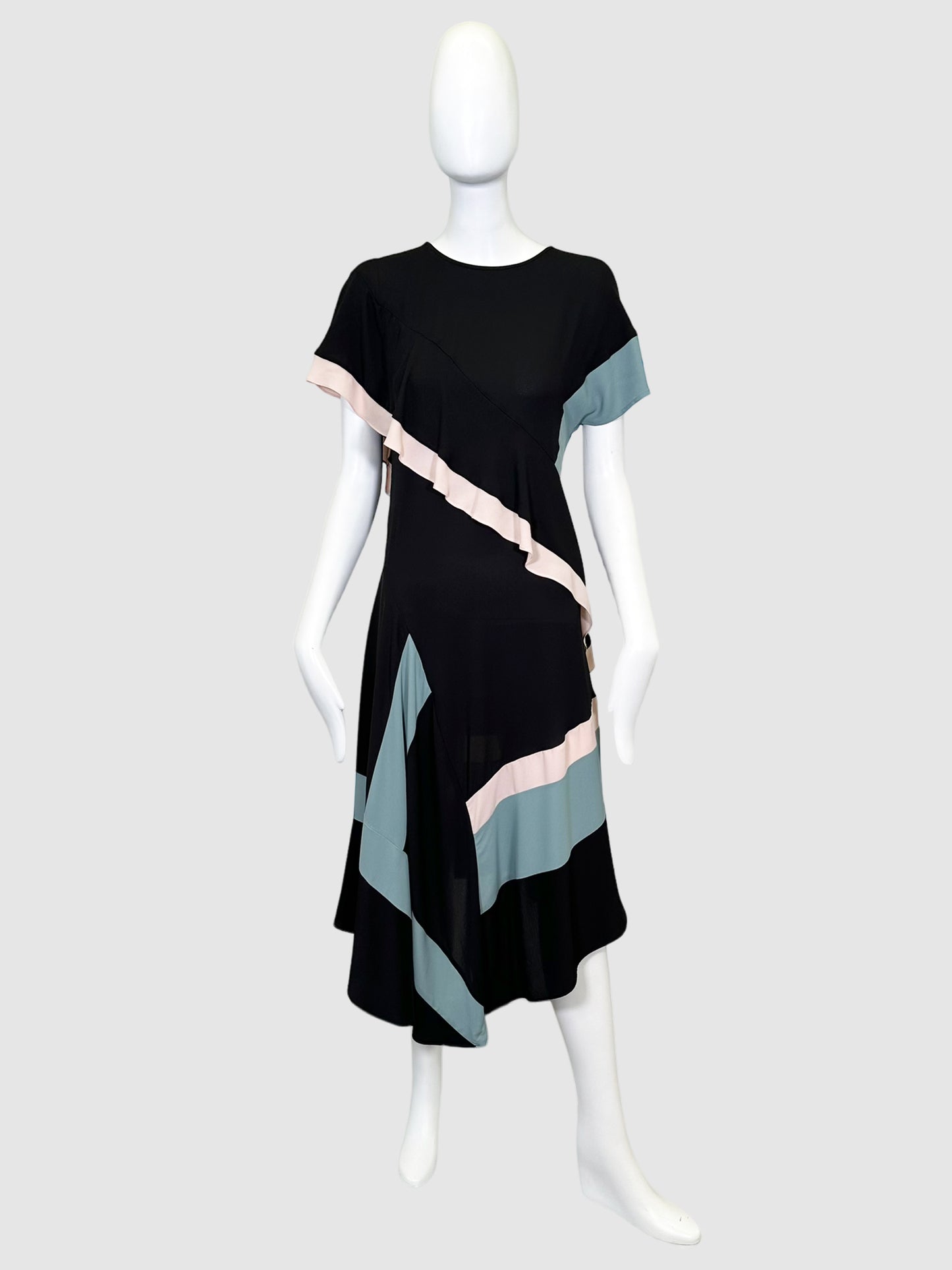 BCBG Maxazria Black, Teal and Pink Ruffle Midi Dress, Size 2.