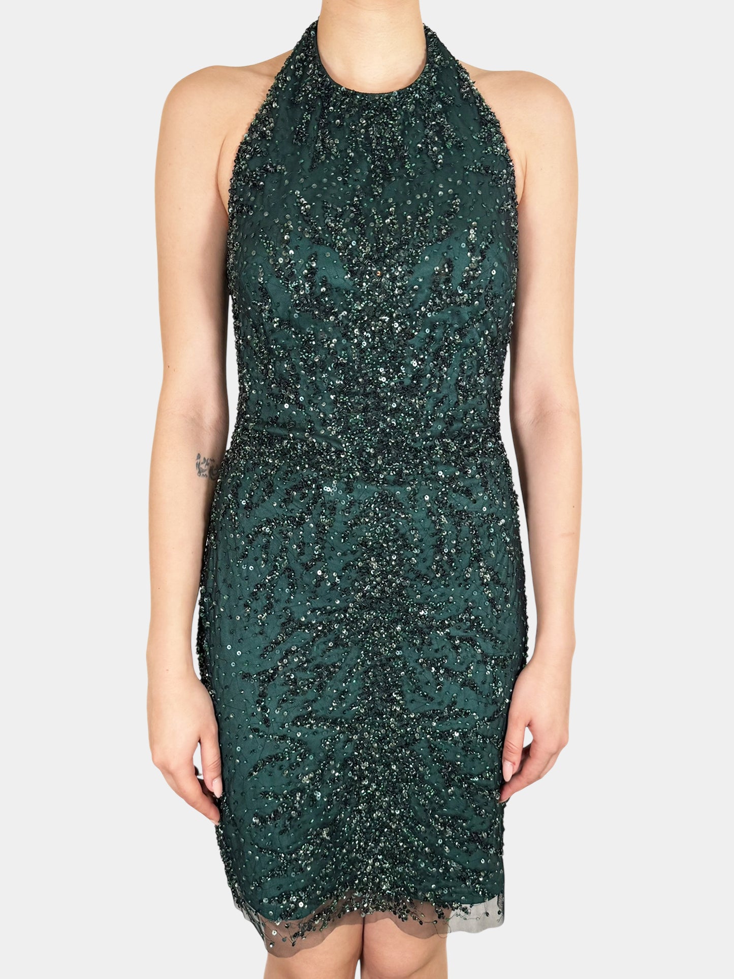 Aidan Mattox Emerald Green Beaded Sequinned Halter Neck Mini Dress, Size 2.