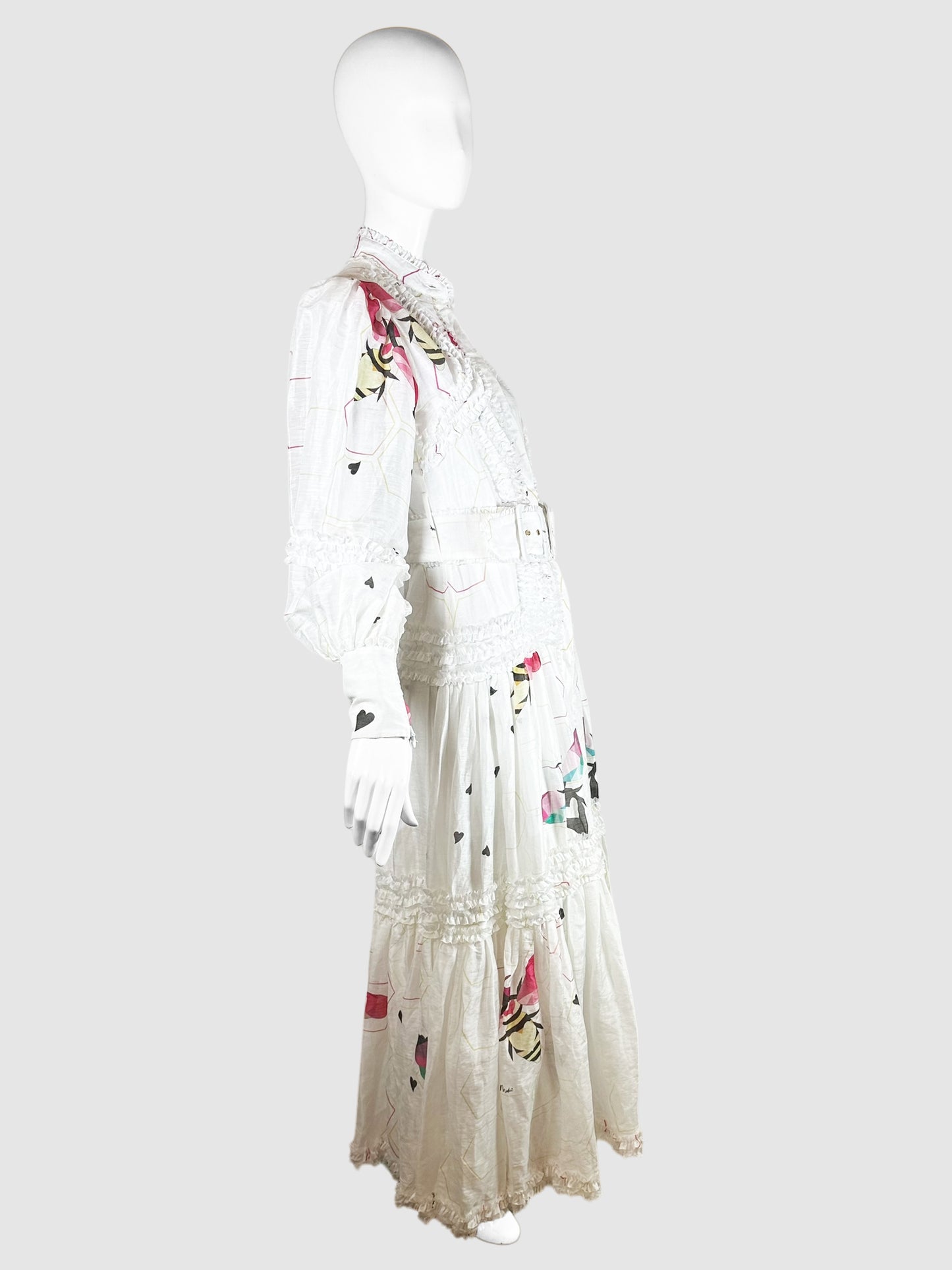 Mackenzie Mode White with Multicolour Bee Print Ruffled Maxi Dress with Belt - Size 4.