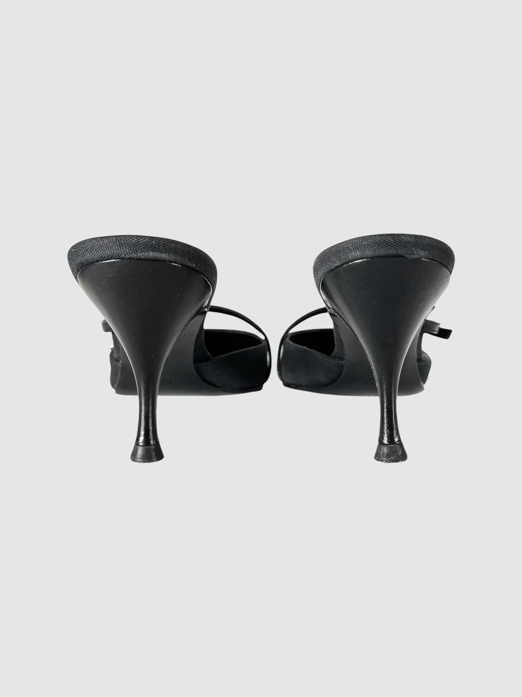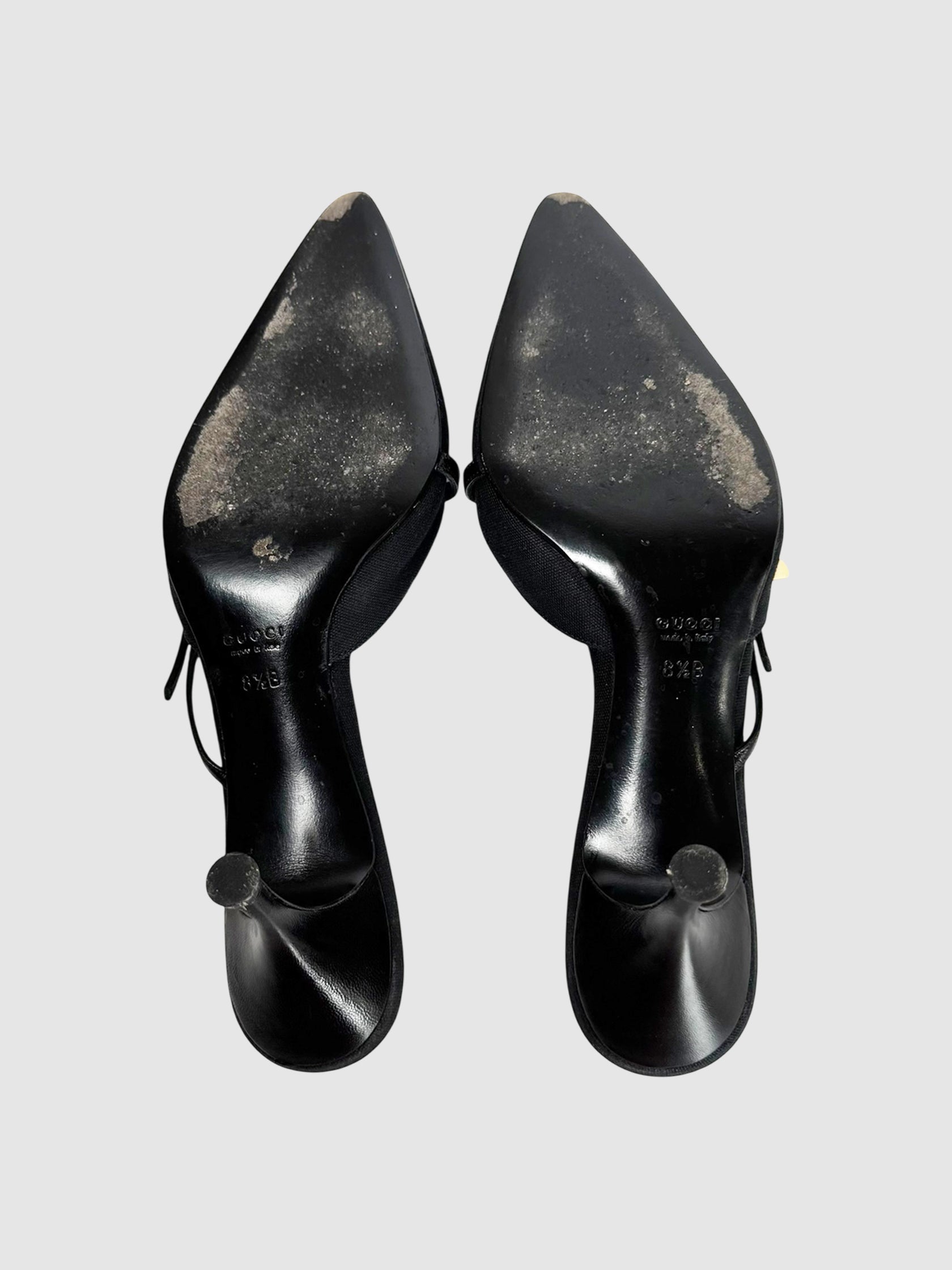 Gucci Black Canvas Mules with Small Leather Strap and Buckle Design, Size 38.5.