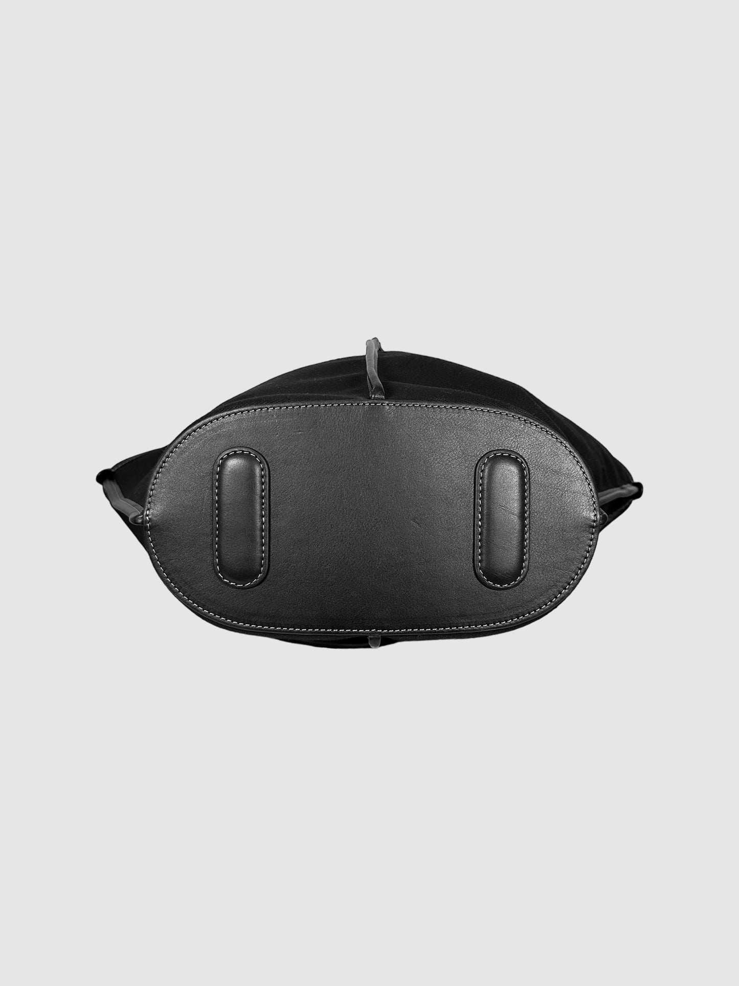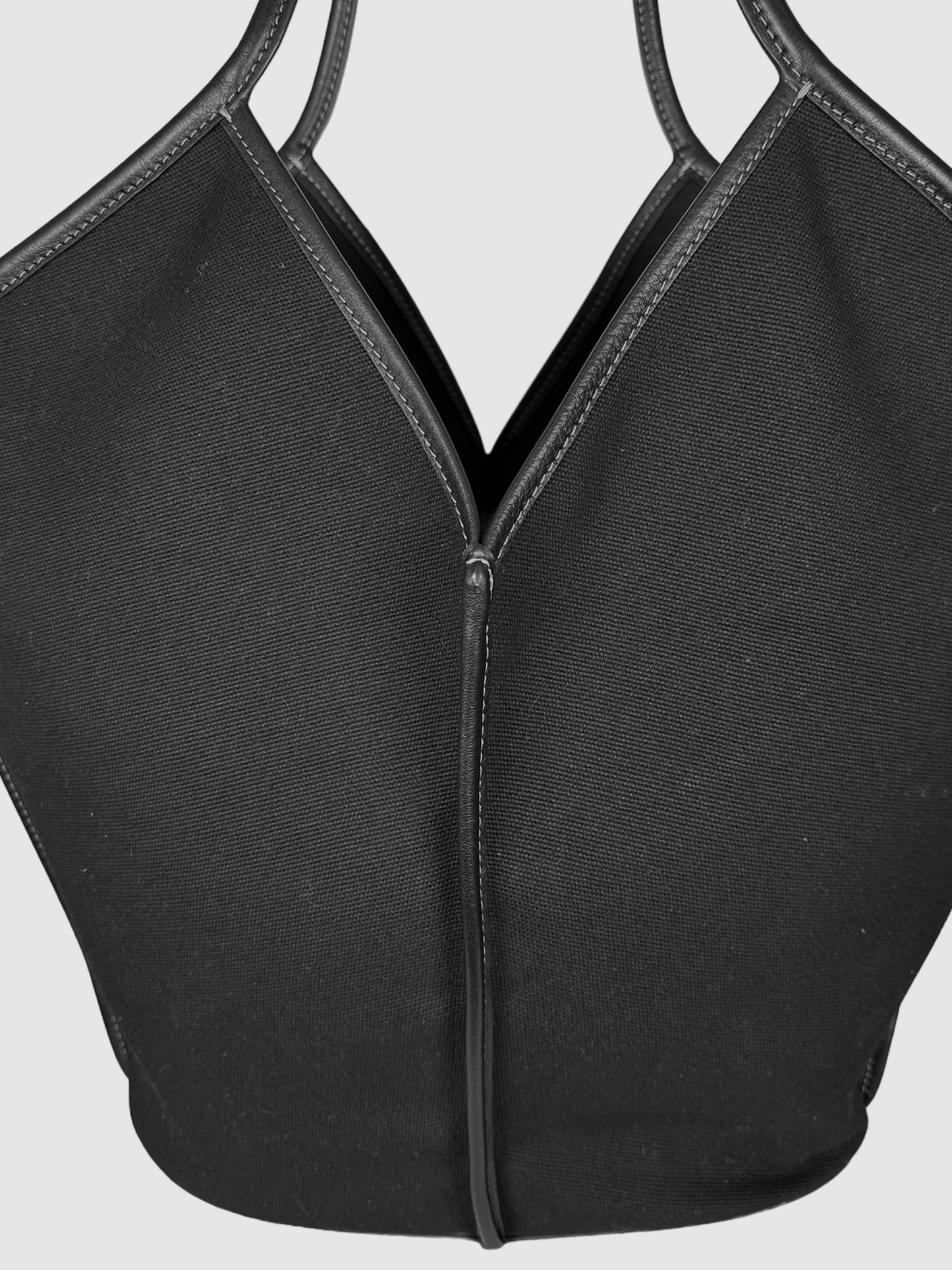 Hereu Black Canvas Calella Tote Bag with Leather Trim/Detailing, White Contrast Stitching, and Pouch.