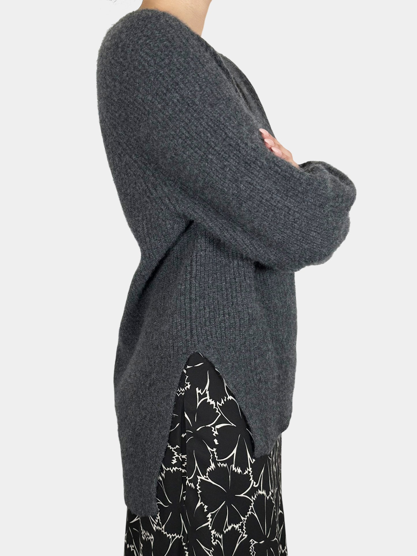 White + Warren Dark Grey Cashmere V-Neck High Low Sweater, Size Large.