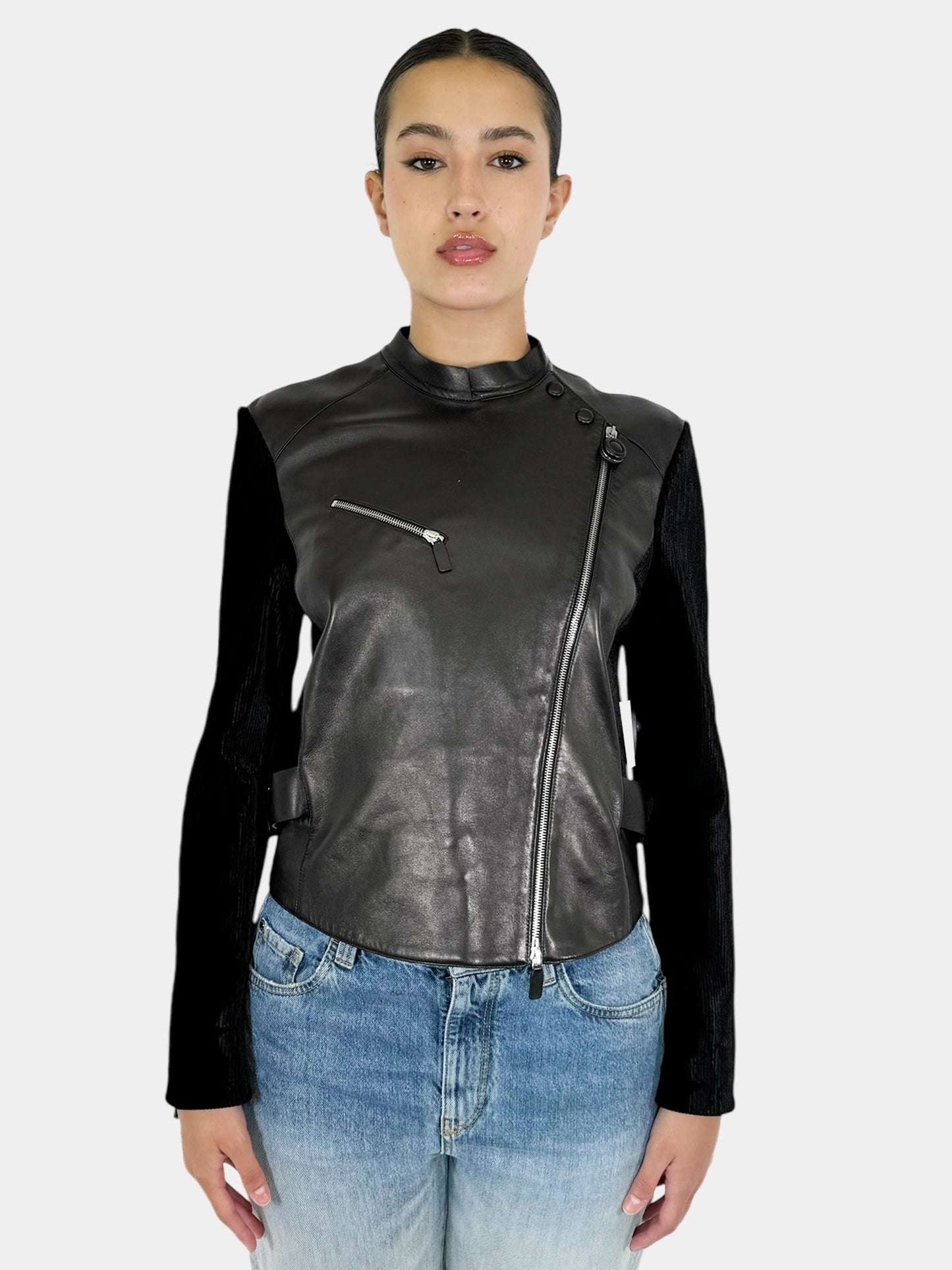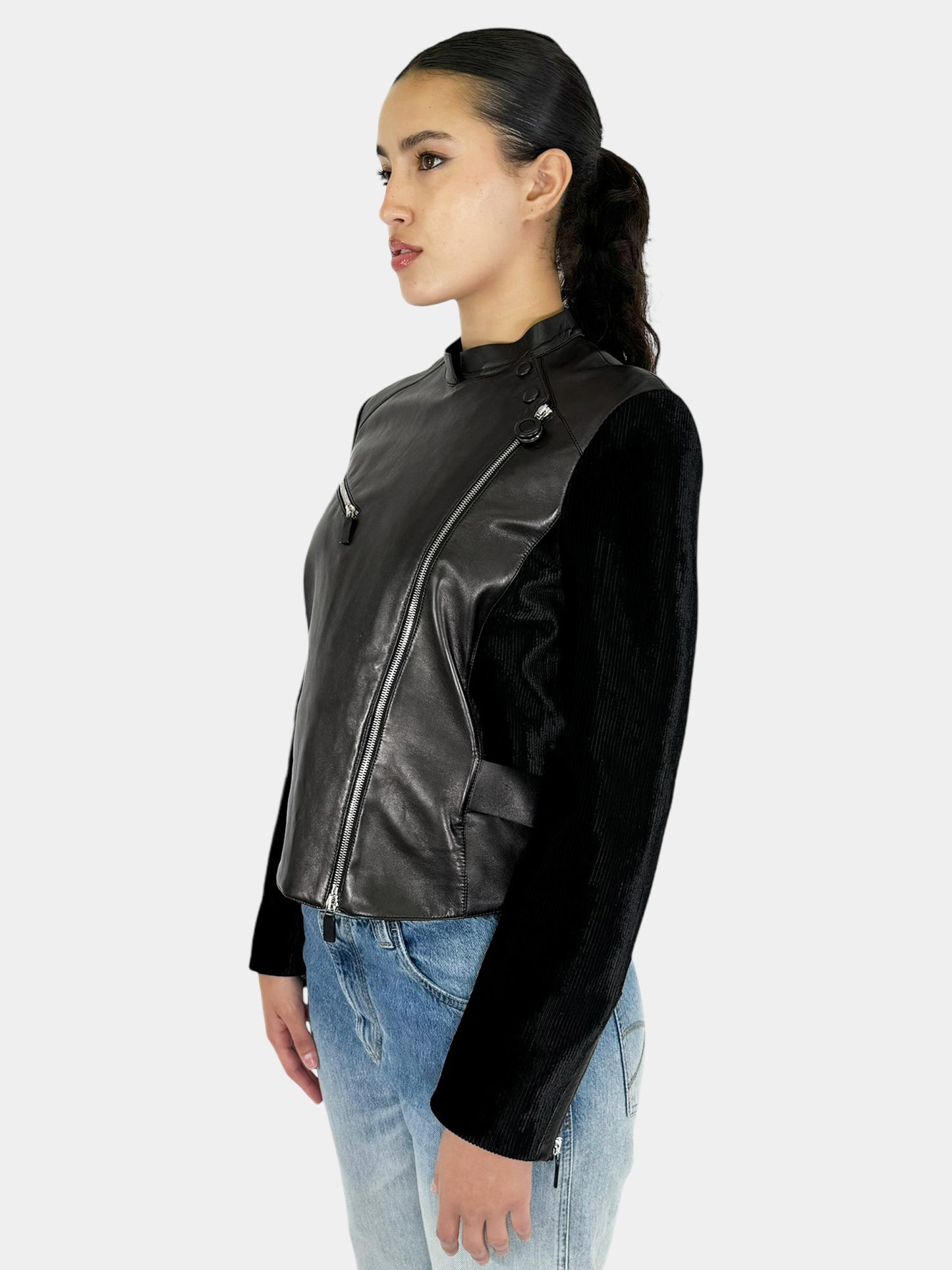 Giorgio Armani Black Corduroy Sleeve Leather Jacket, Size 42.