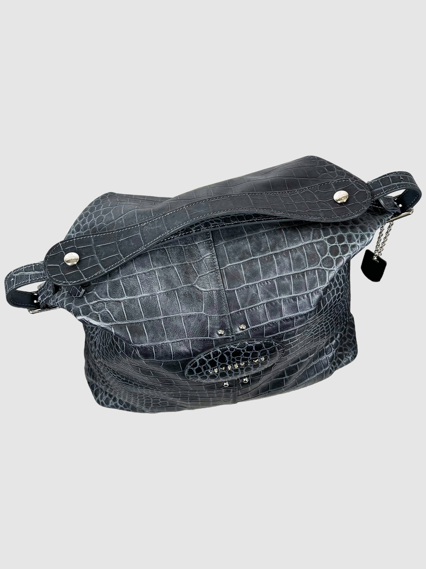 Longchamp Navy Blue Croc Embossed Leather Shoulder Bag.