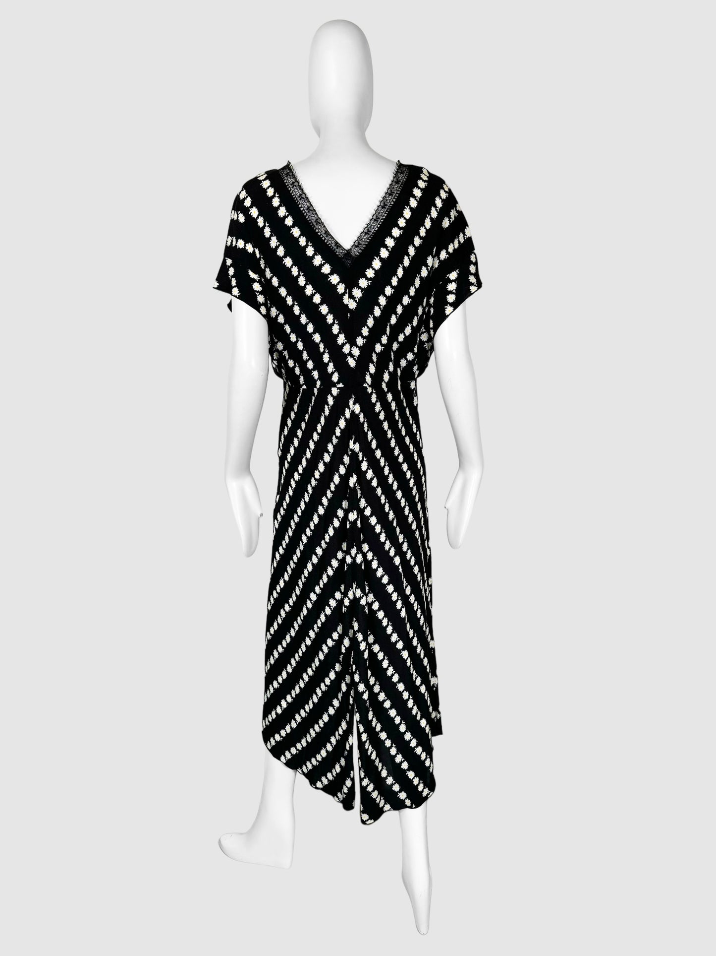 Maje Black, White, and Yellow Daisy Chain Midi Dress with Lace Trim V-Neck - Size 4.