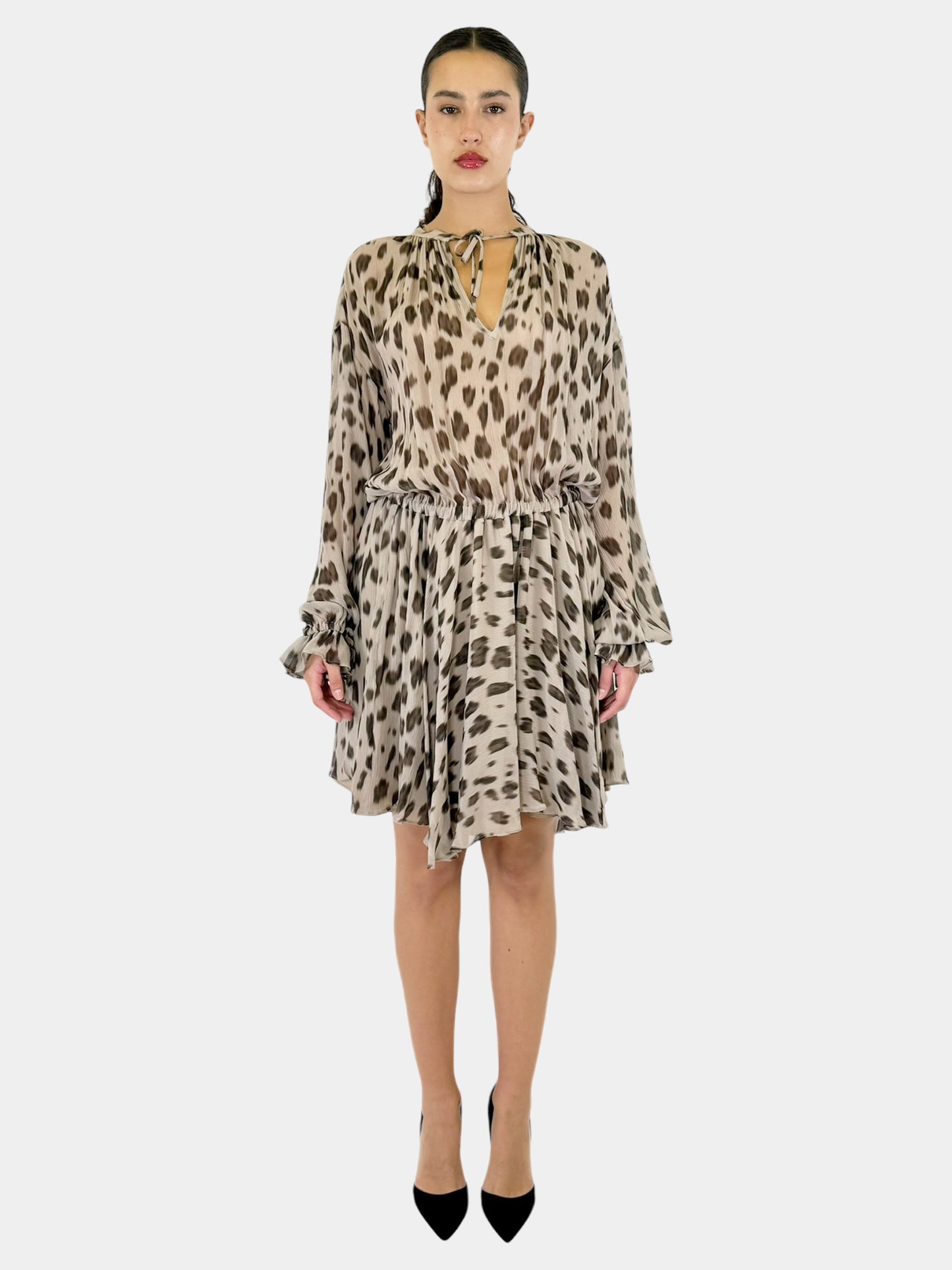 Anine Bing Beige and Brown Silk Elliana Leopard Print Long Sleeve Semi-Sheer Mini Dress with Elasticized Waist and Arm Cuffs, Size Medium.