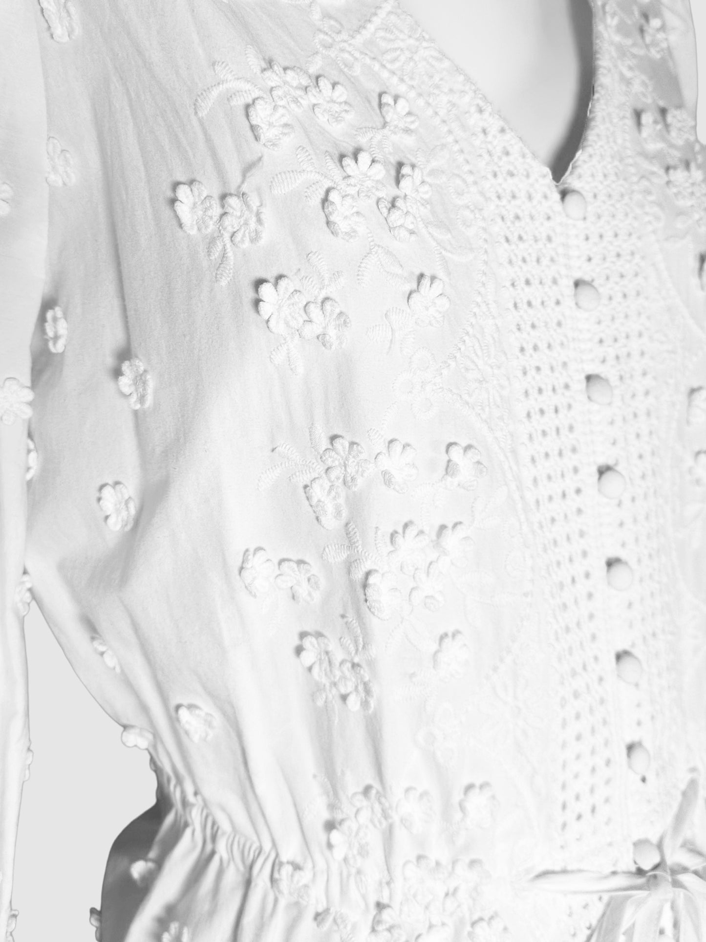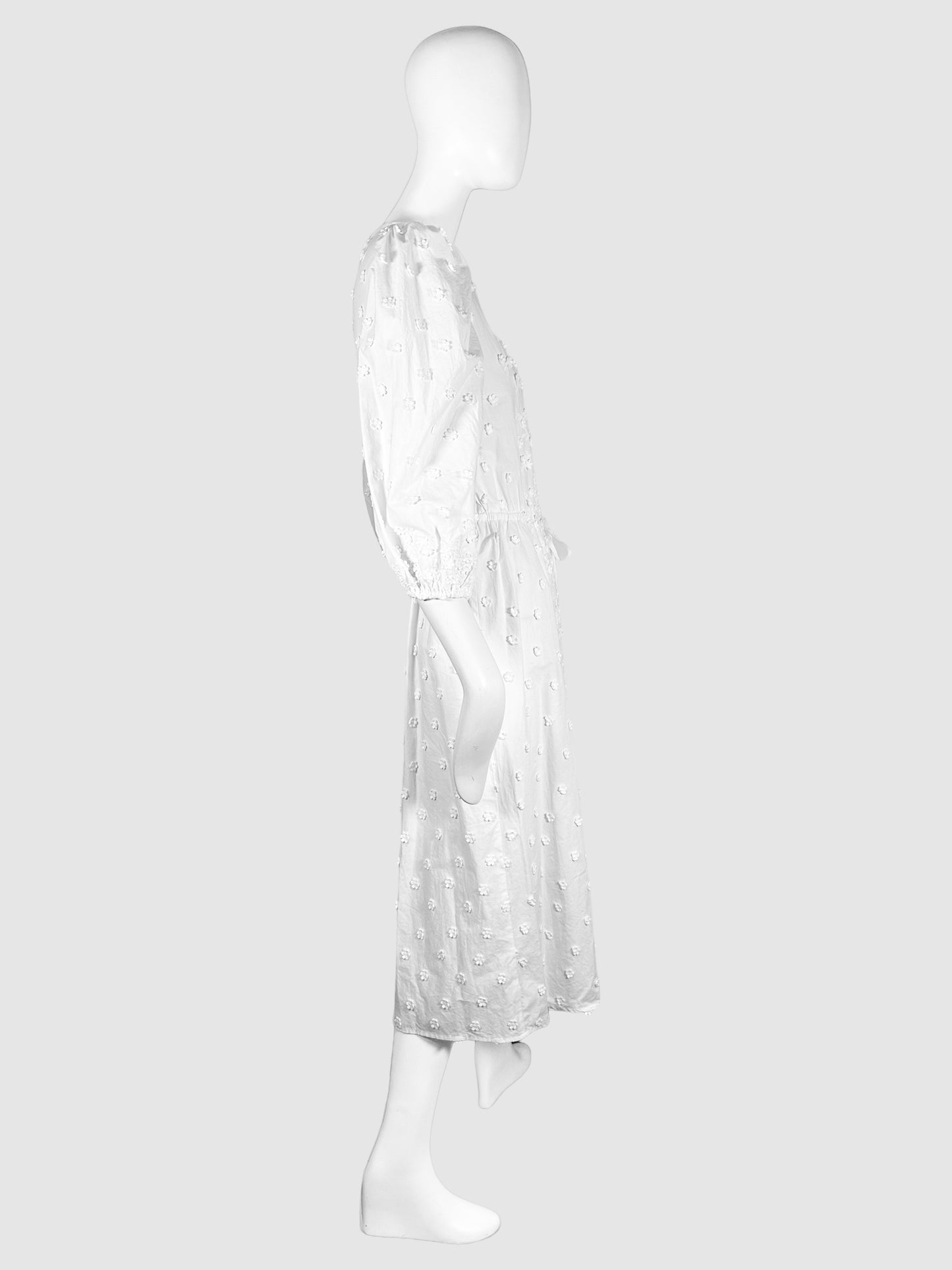 Maje White V-Neck Long Sleeve Midi Dress with Embroidered Flowers and Puff Sleeves- Size 42.