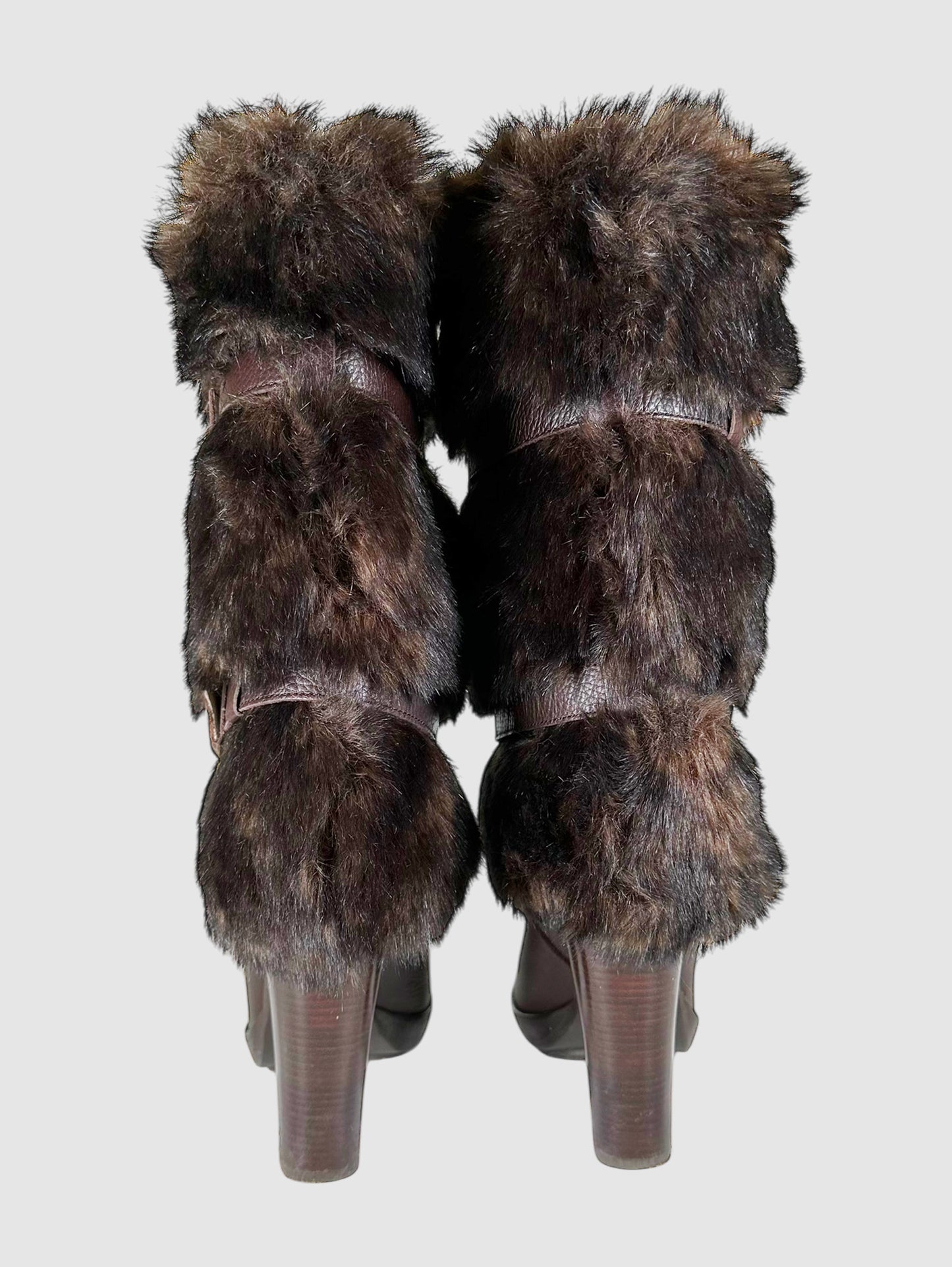 Michael Kors Brown Leather and Faux Fur Trim Belted Heeled Boots - Size 7.