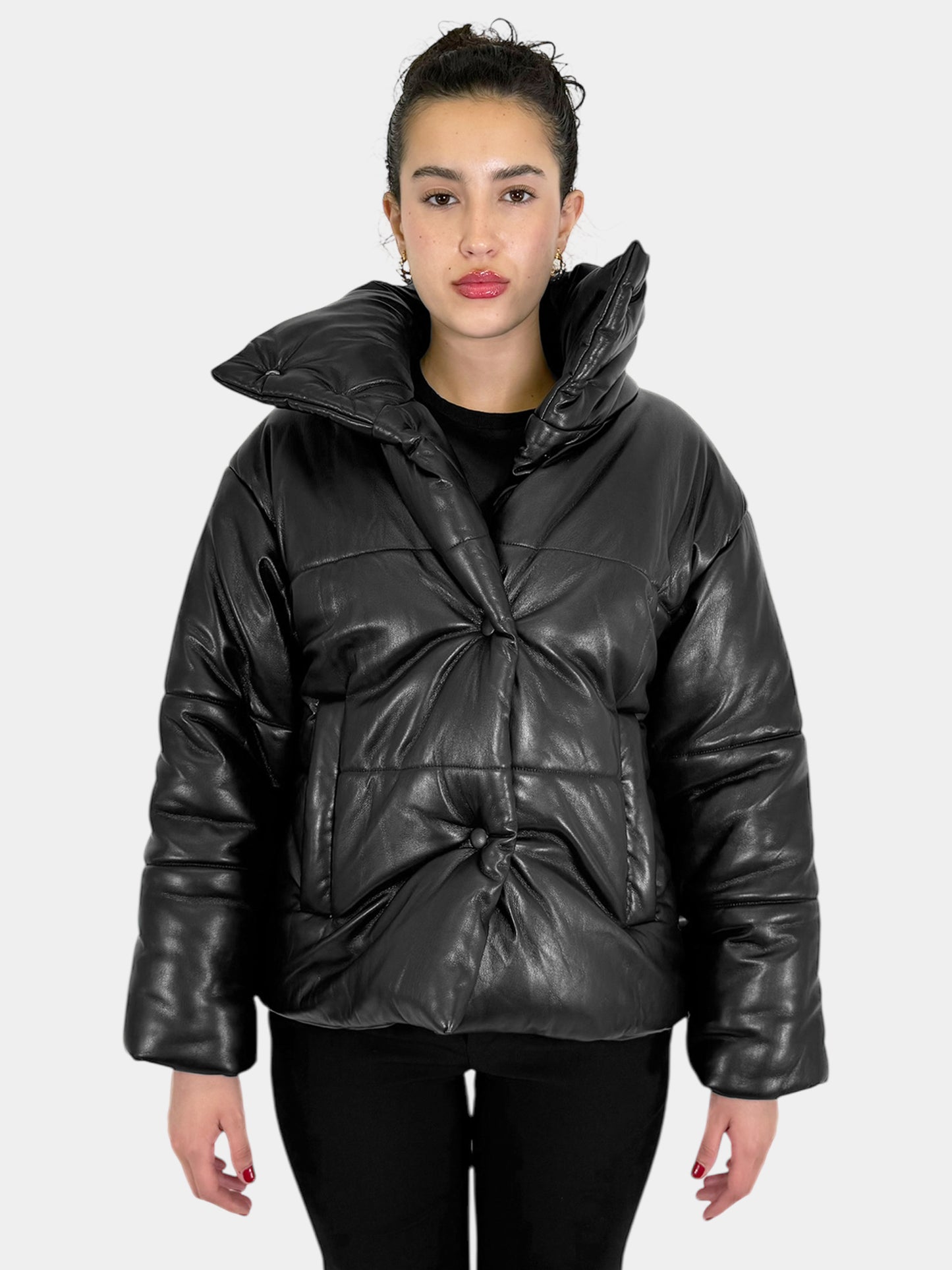 Nanushka Black Faux Leather Short Puffer Jacket with Snap Button Closure, Size Extra Small.