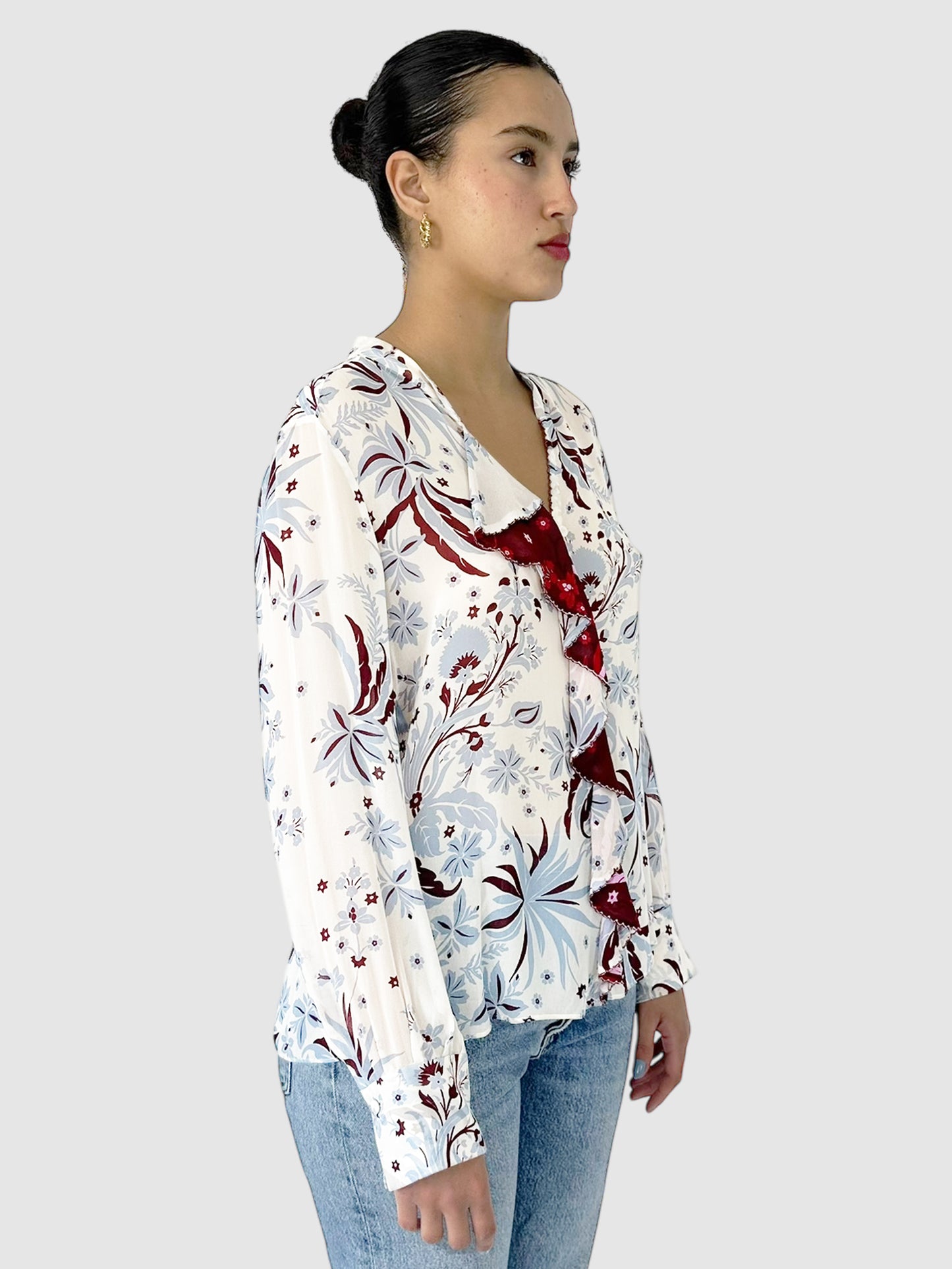 Dorothee Schumacher White, Blue, Red, and Pink Floral Ruffled Long Sleeve Top - Size 4.