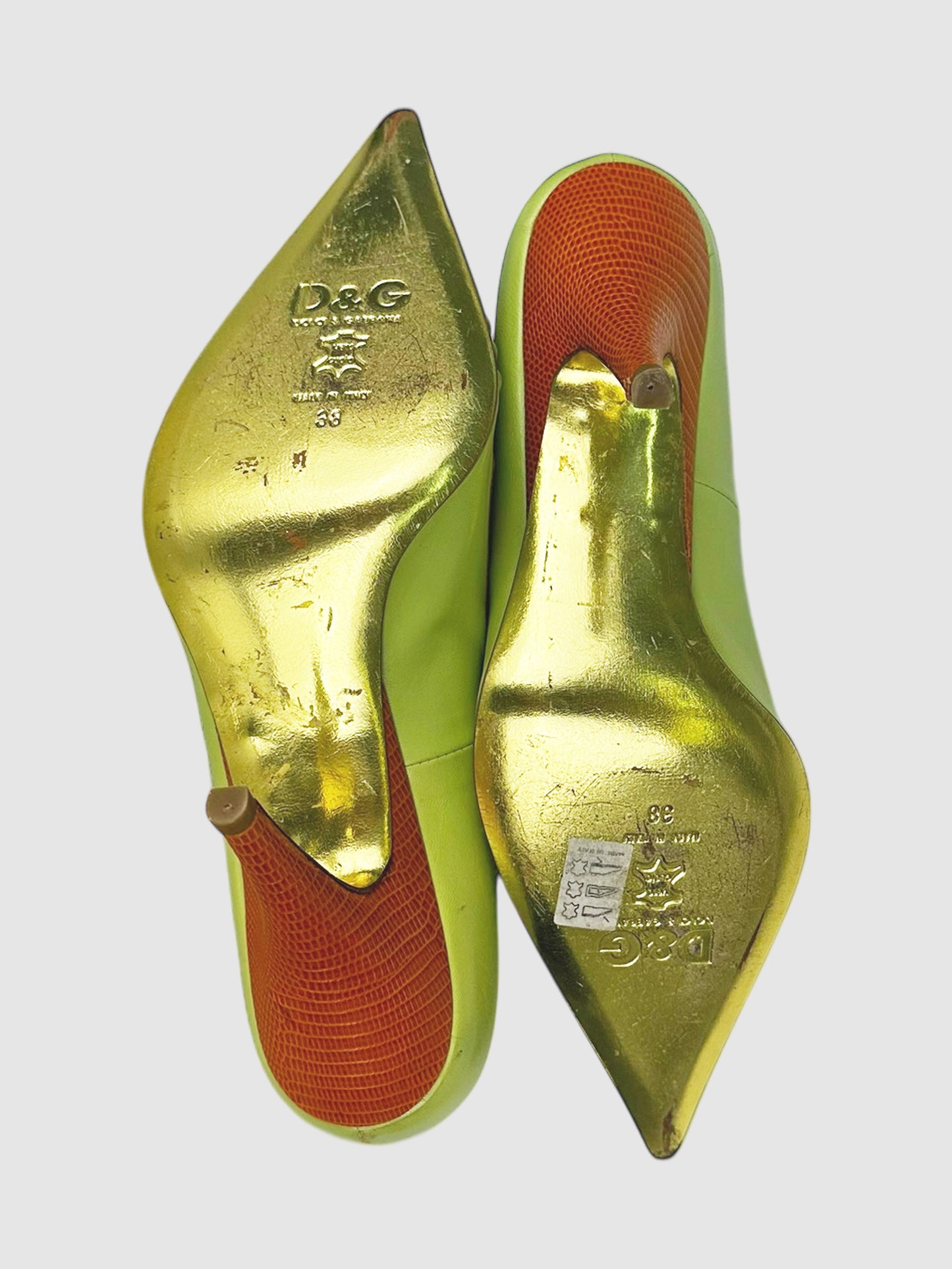 Dolce & Gabbana Green Leather Flower Detail Pointed Toe Pumps with Snake Print Heels - Size 38.