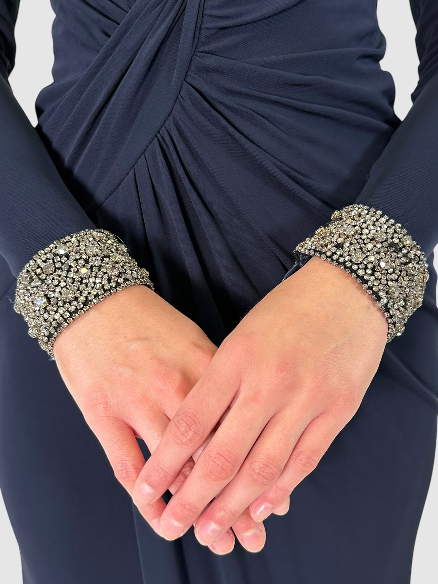 David Meister Navy Blue Front Ruched Long Sleeve Maxi Dress with Beaded Wrists - Size 4.