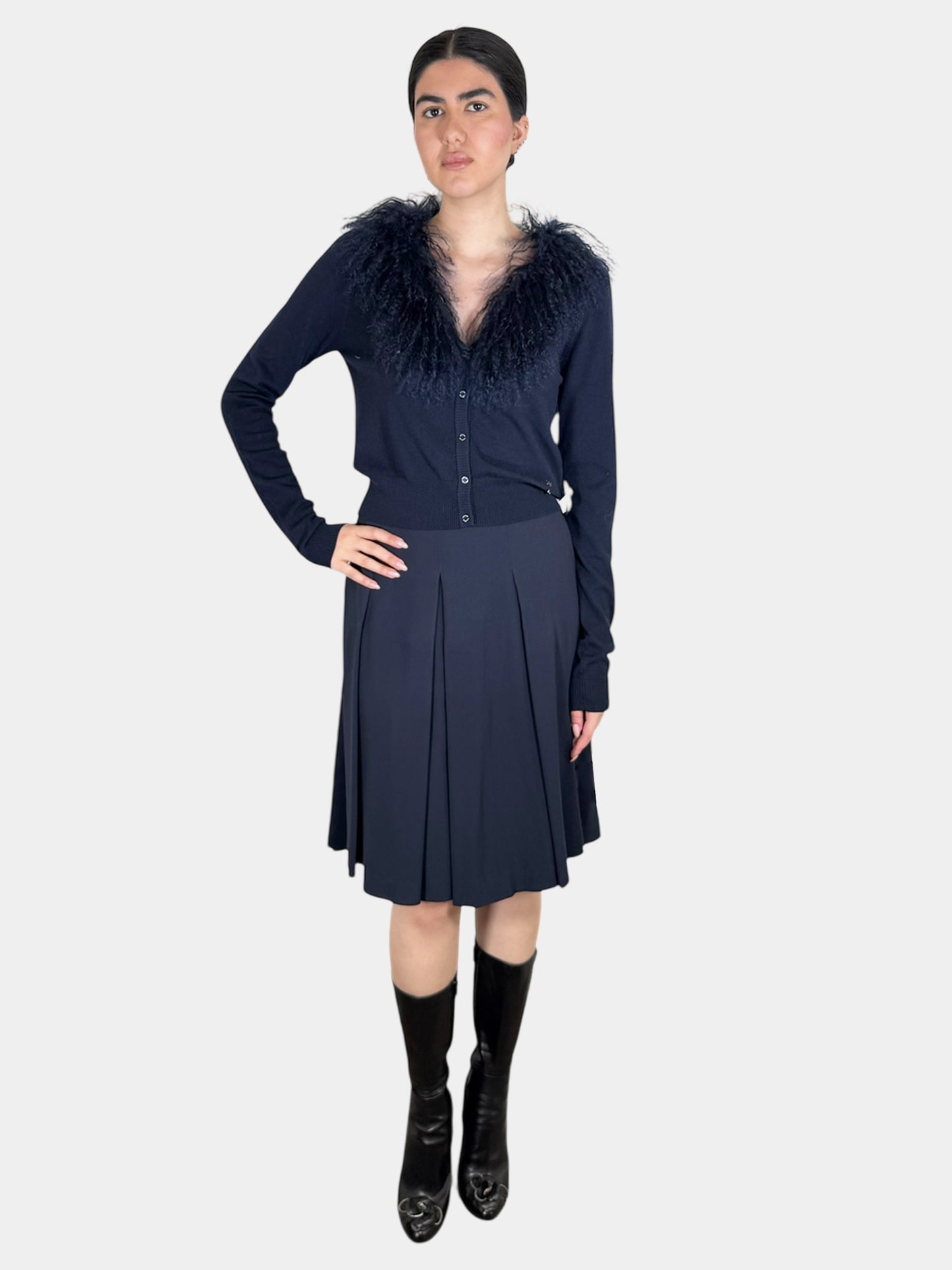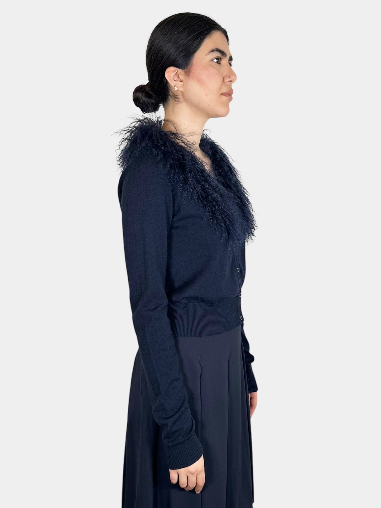 Kocca Navy Blue Detachable Fur Collar Button-Up Cardigan, Size Extra Large.
