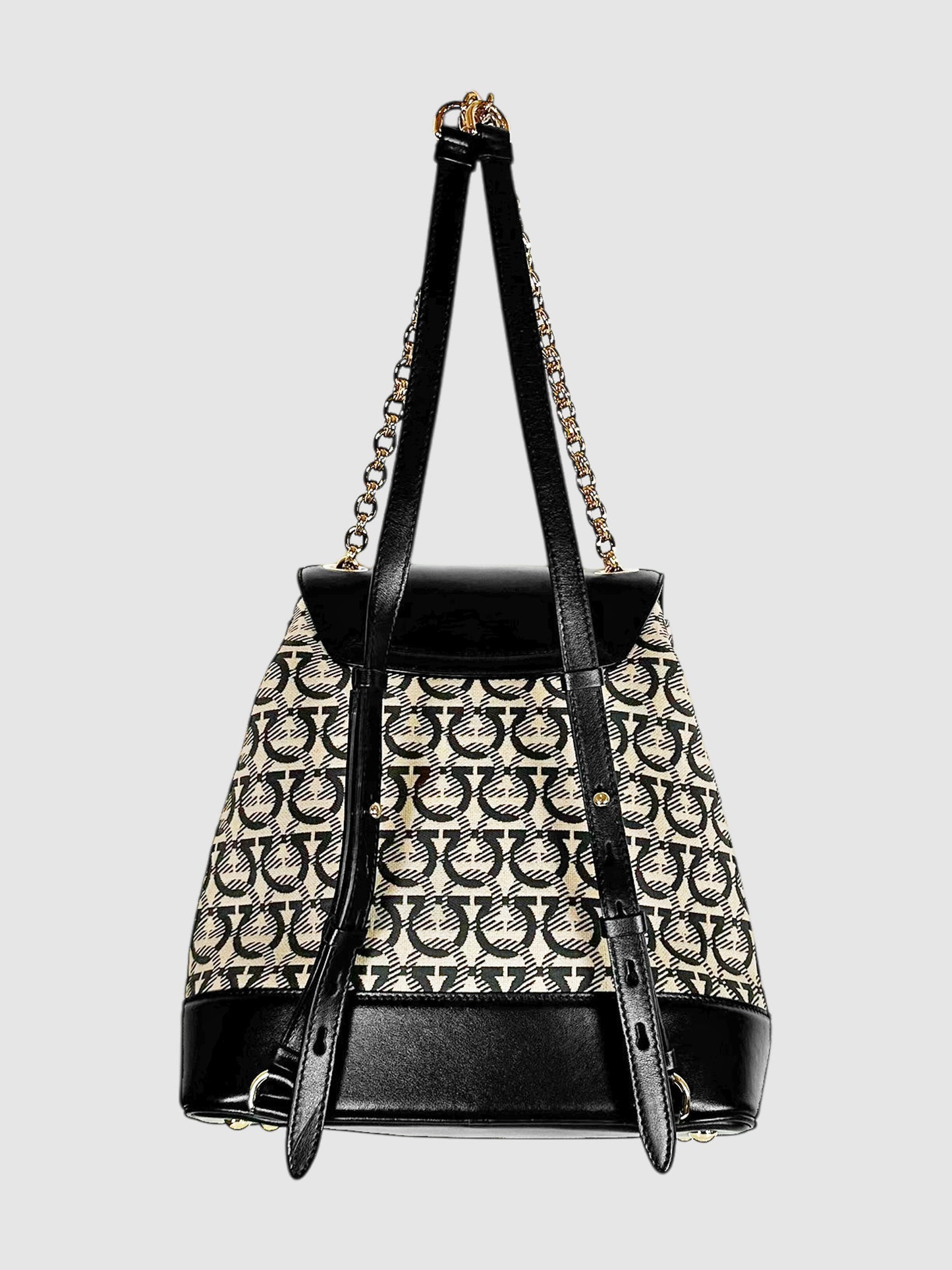 Salvatore Ferragamo Black, Beige, Green, and White Leather and Canvas Gancini Monogram Chain Strap Backpack with Floral Embroidery.