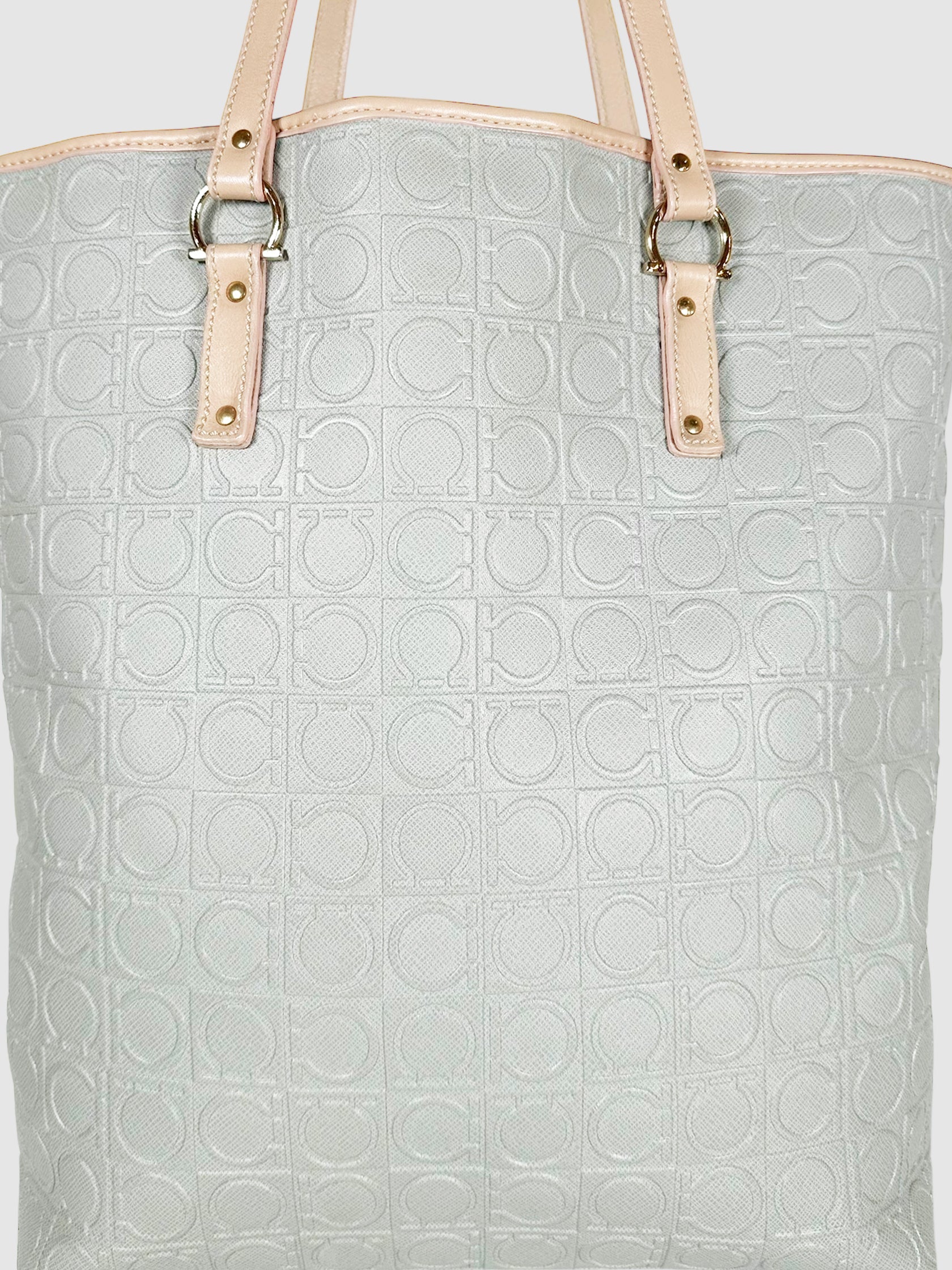 Salvatore Ferragamo Grey-Blue Leather Gancini Monogram Tote Bag.