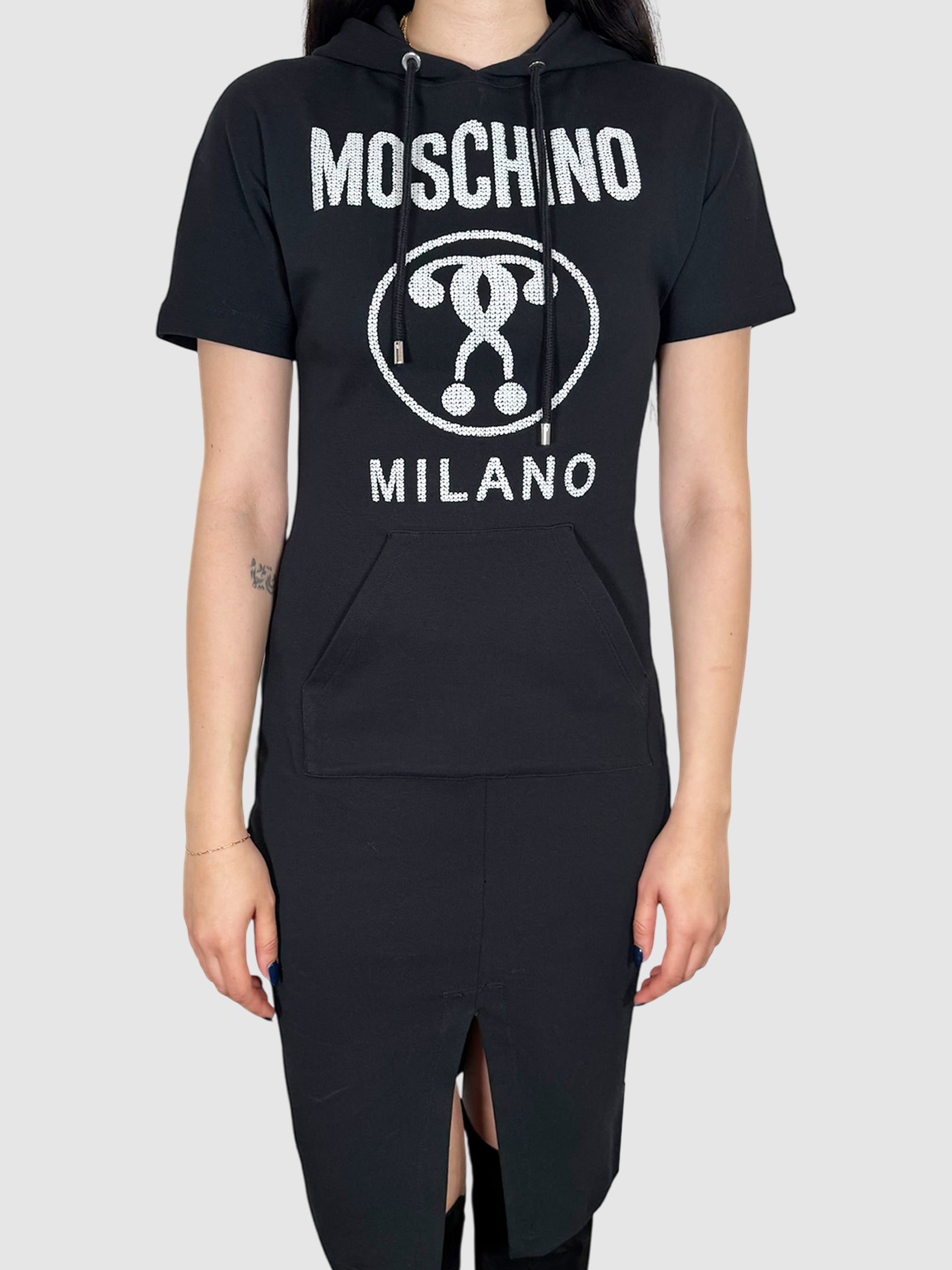 Moschino Black Short Sleeve Graphic Hoodie Knee-Length Dress, Size 4.