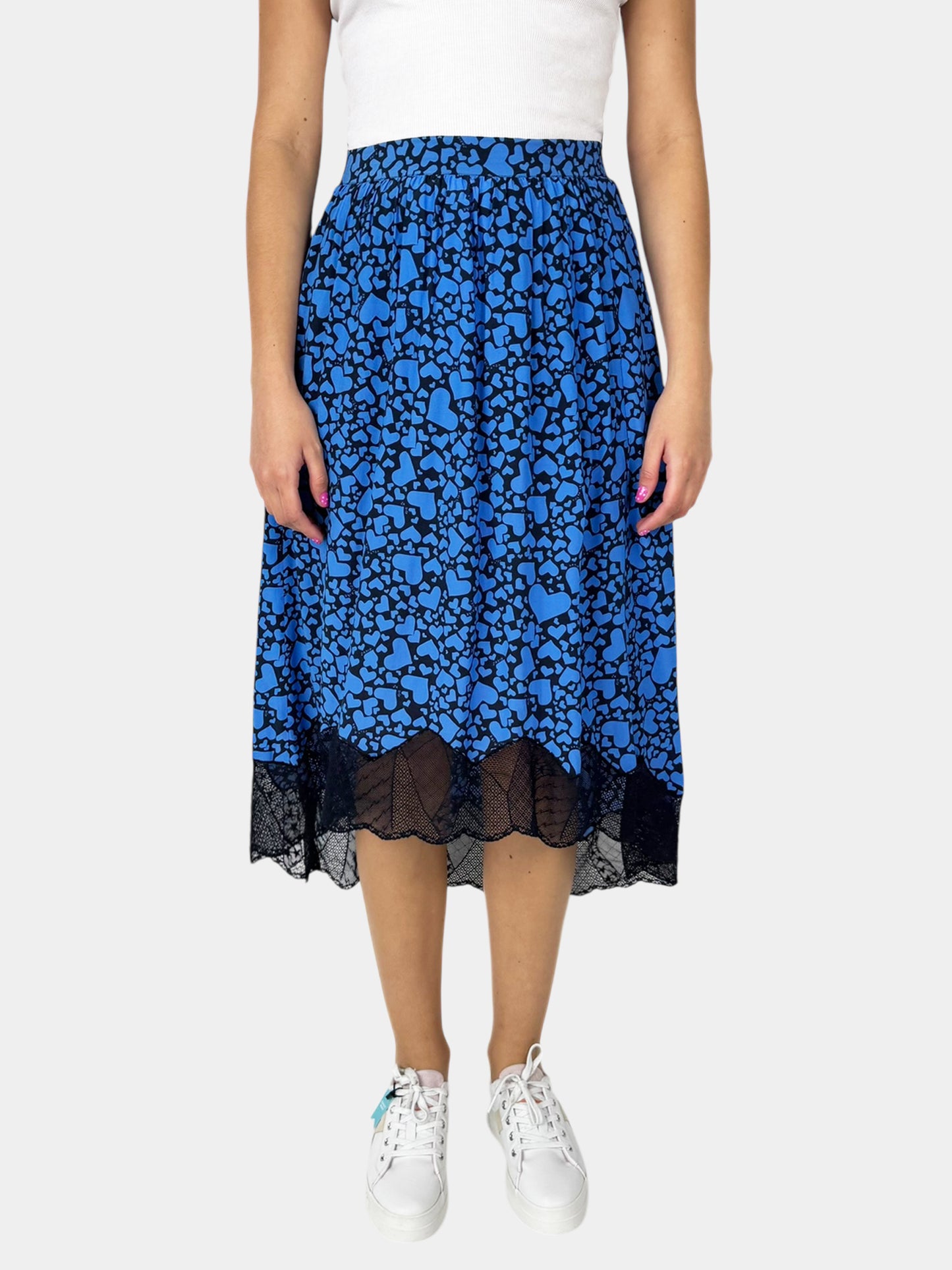 Zadig & Voltaire Blue and Black Heart Print Midi Skirt with Bottom Lace Trim and Elasticized Waistband, Size 38.