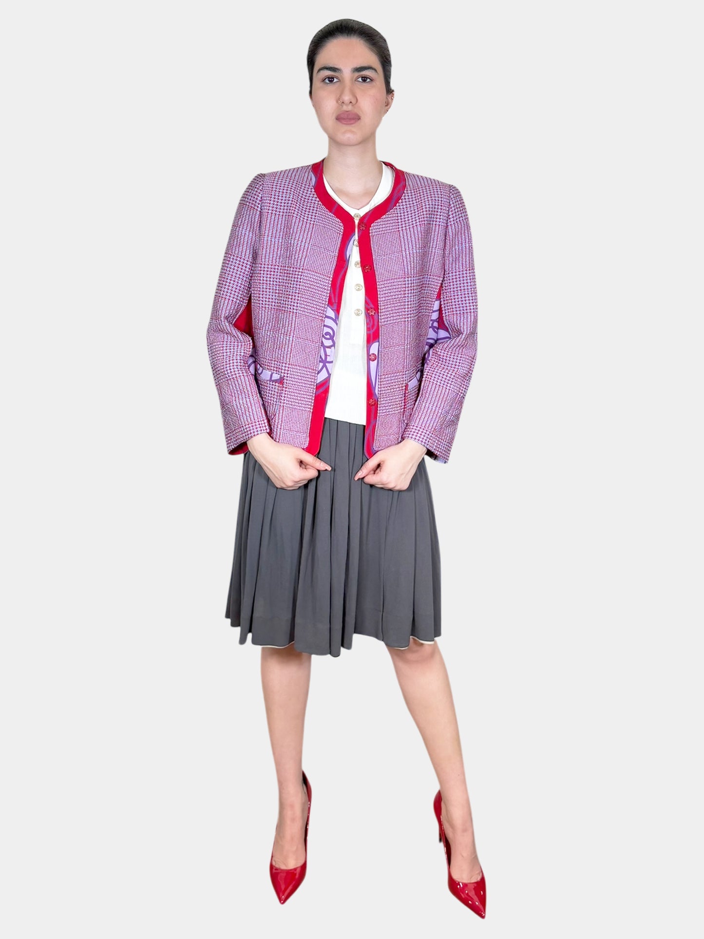Giorgio Armani Red and Purple Houndstooth and Floral Print Trim Jacket with Snap Button Closure, Size 46.