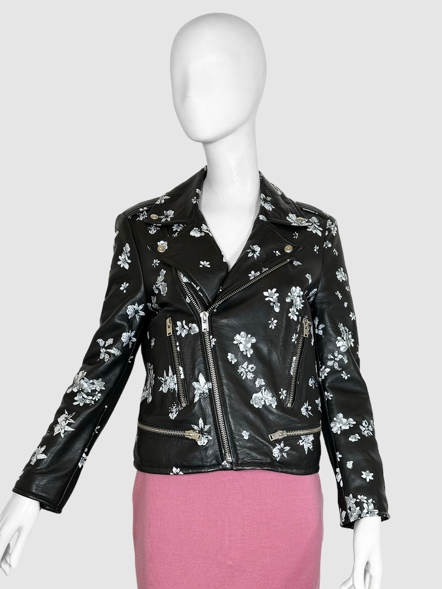 IRO Black Leather Moto Jacket with White and Blue Floral Print and Dual Lace-Up Tie on Back, Size 40.