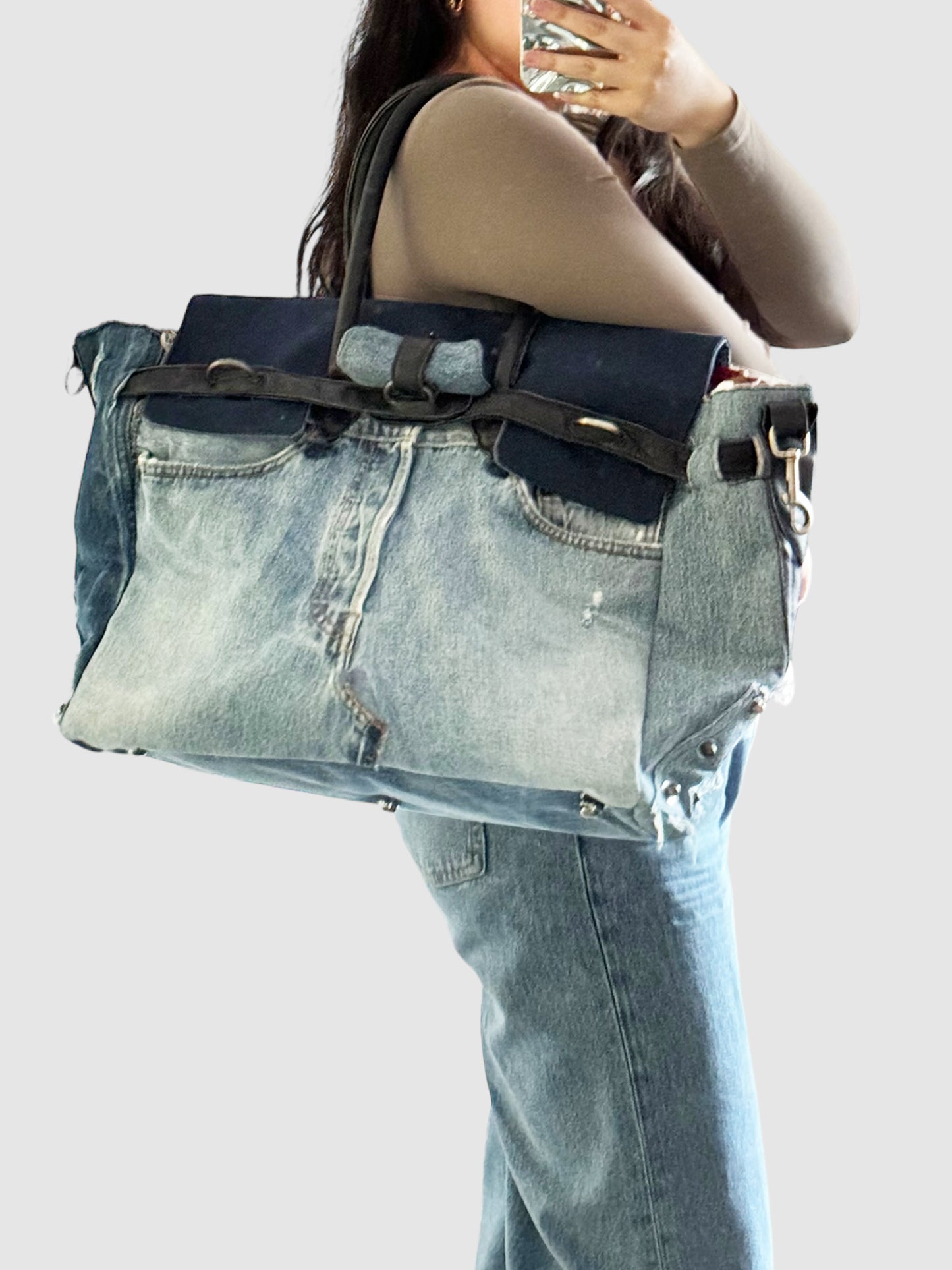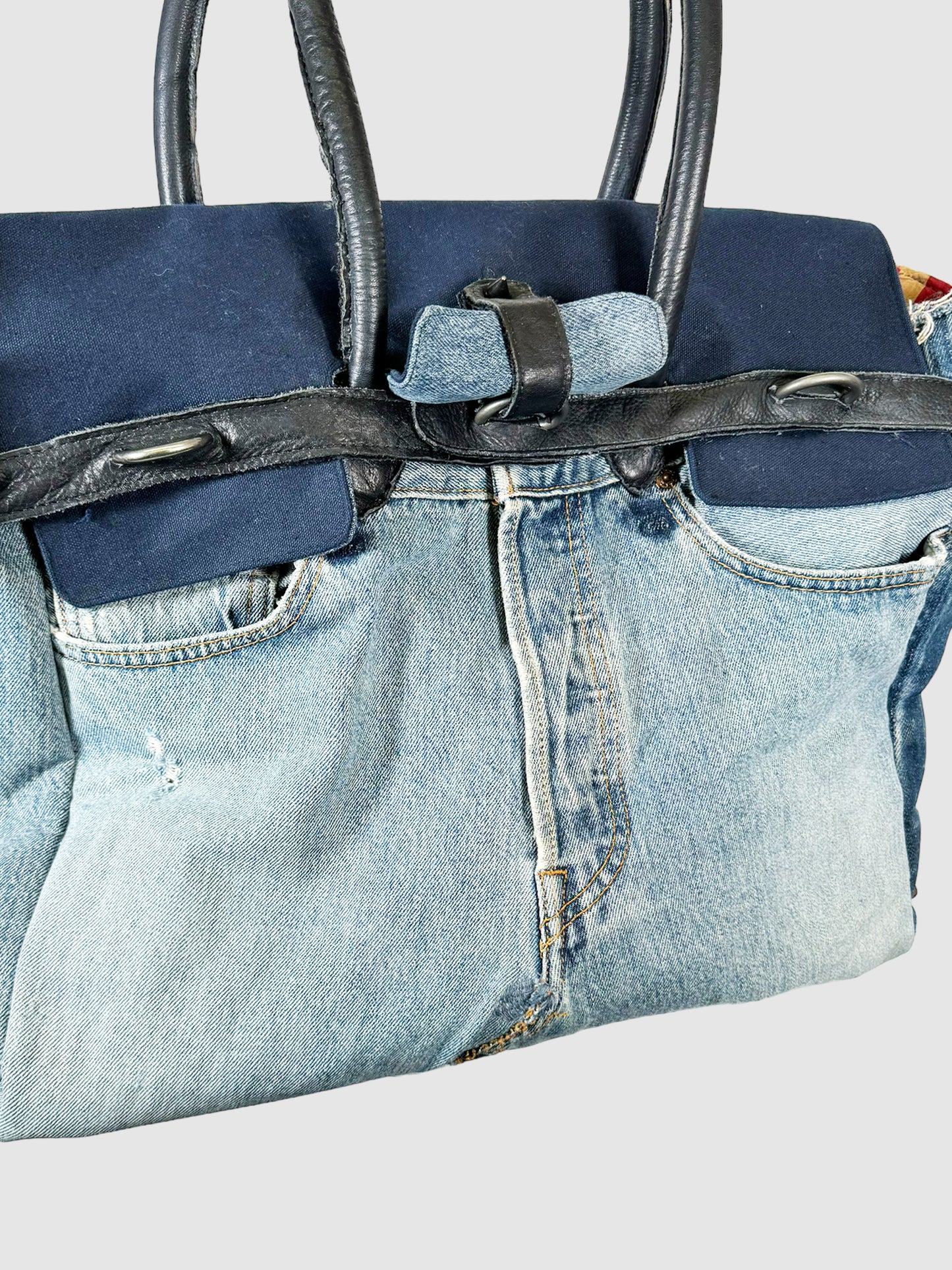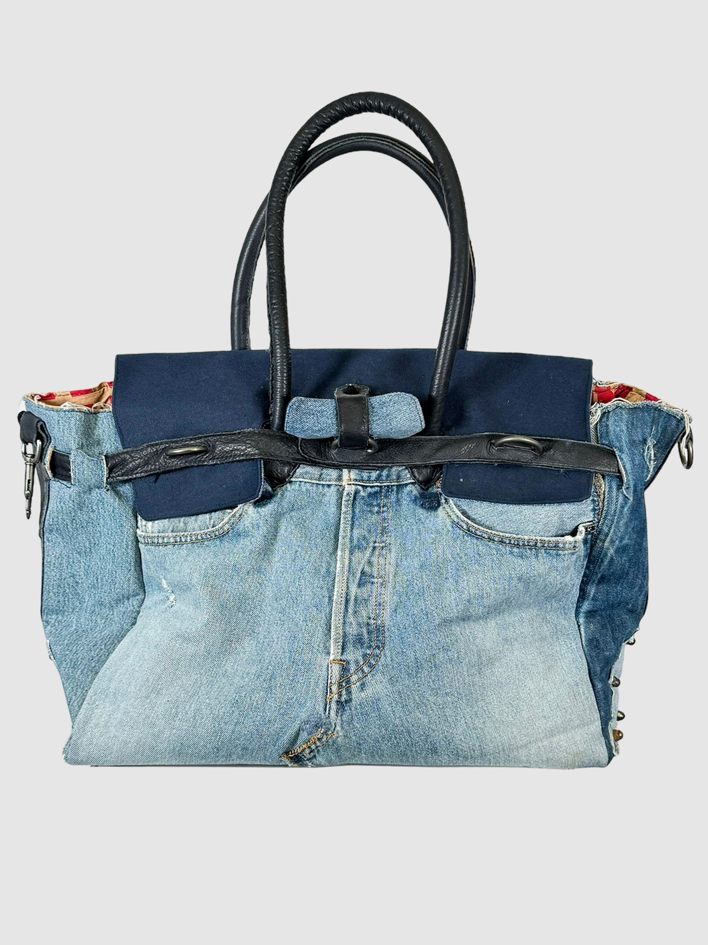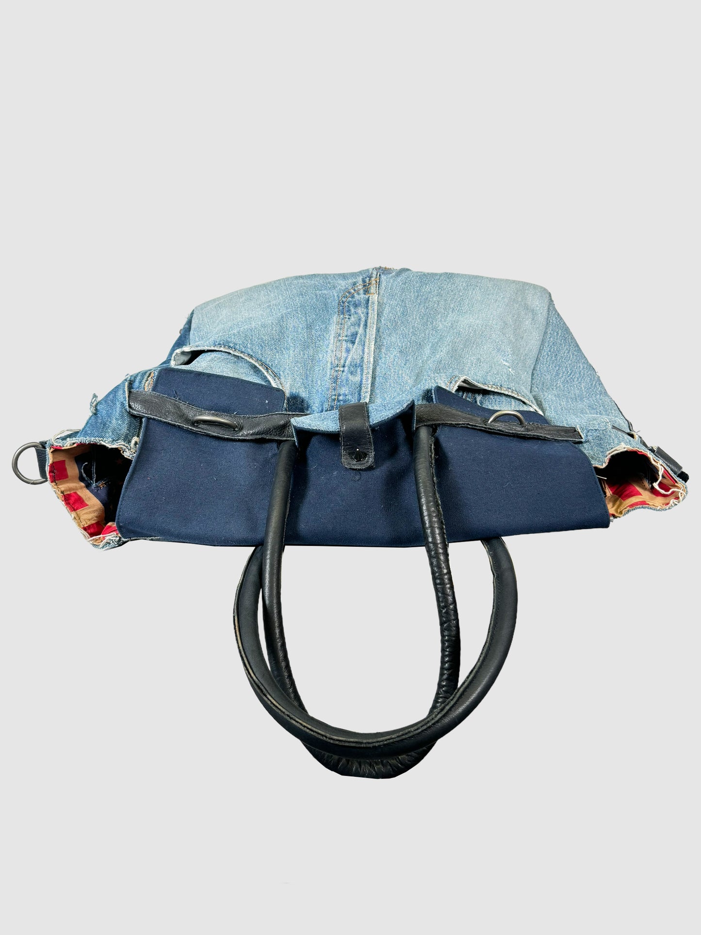 Levi's Union Made Dr. Collectors Travel Bag in Blue Denim and Black Leather Trim. This bag has silver-tone hardware, dual leather handles, a front flap closure, and one interior zip pocket.