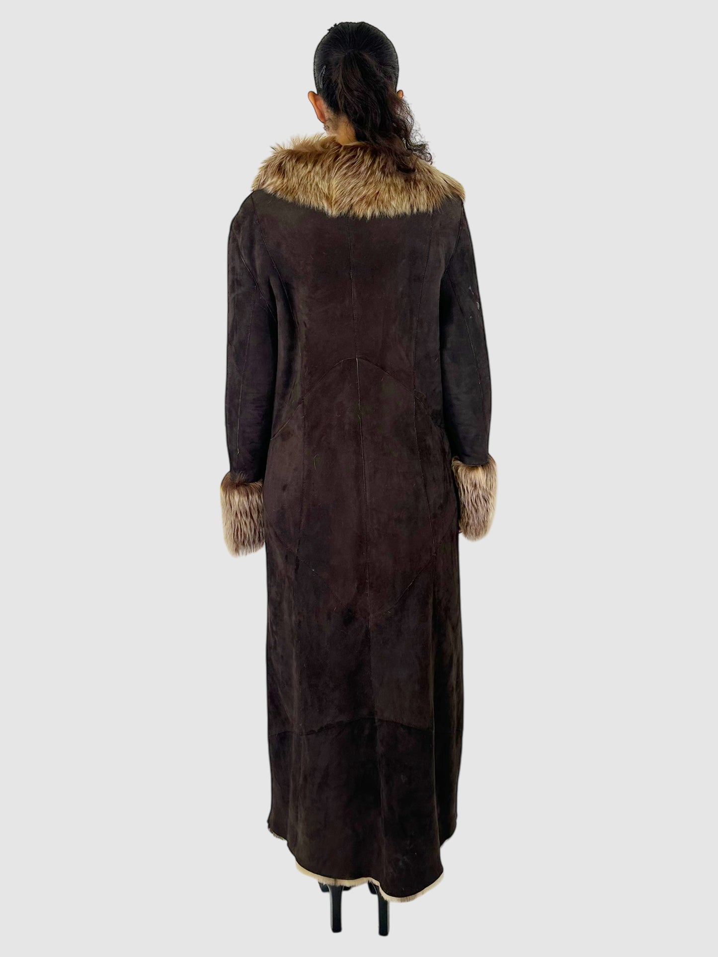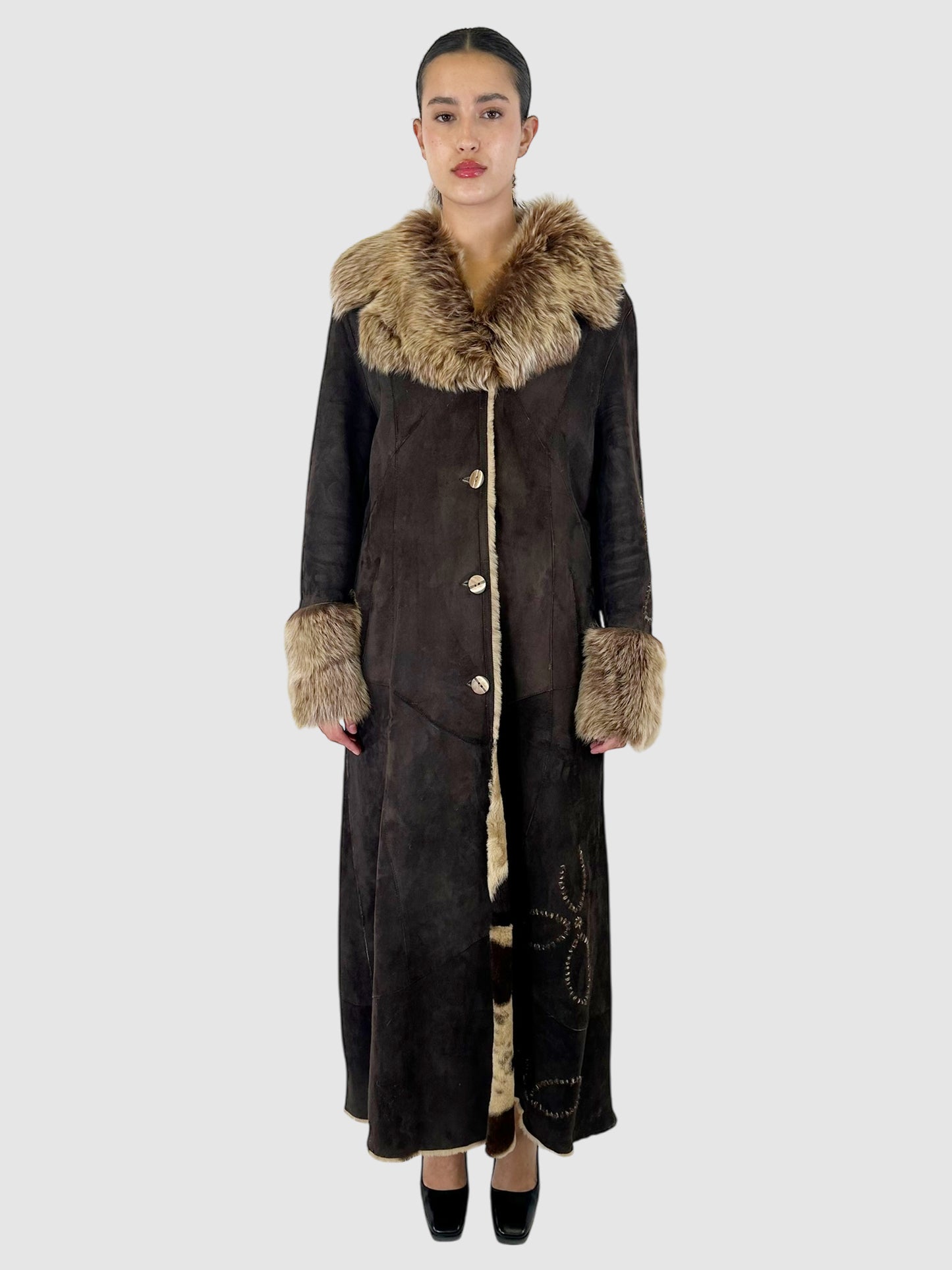 Gregotti Dark Brown Long Shearling Flower Detail Coat with Fur Collar and Cuffs - Size 46.