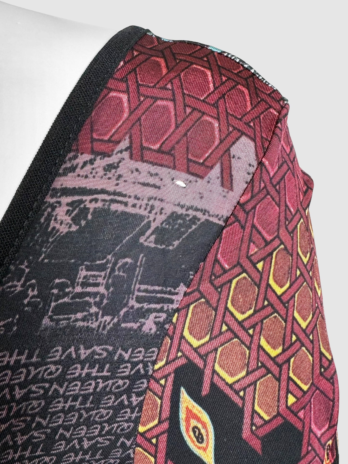 Save The Queen Black and Burgundy Long Sleeve Mesh Top, Size Medium.