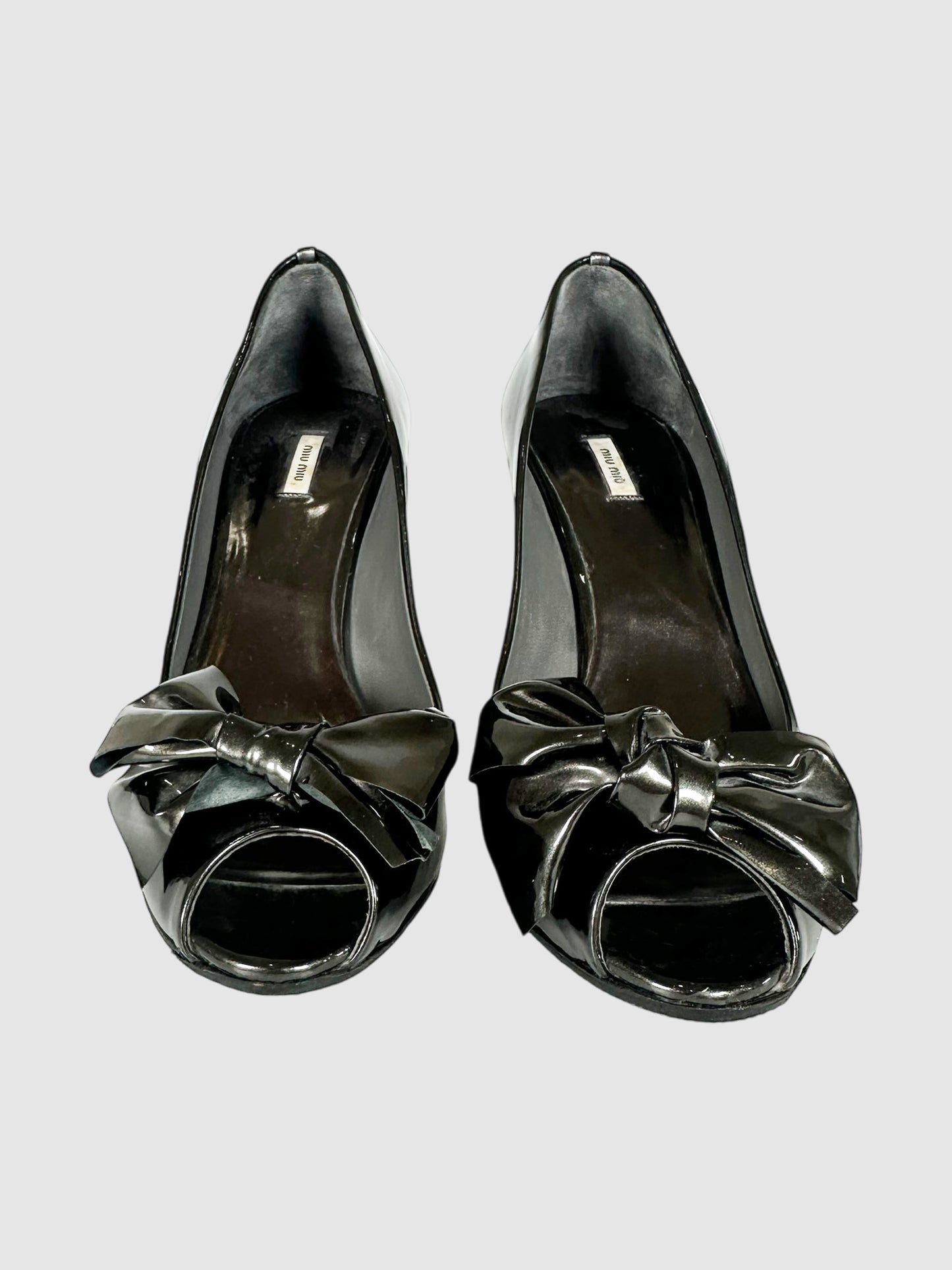 Miu Miu Grey Patent Leather Metallic Bow Accent Pumps - Size 36.5.