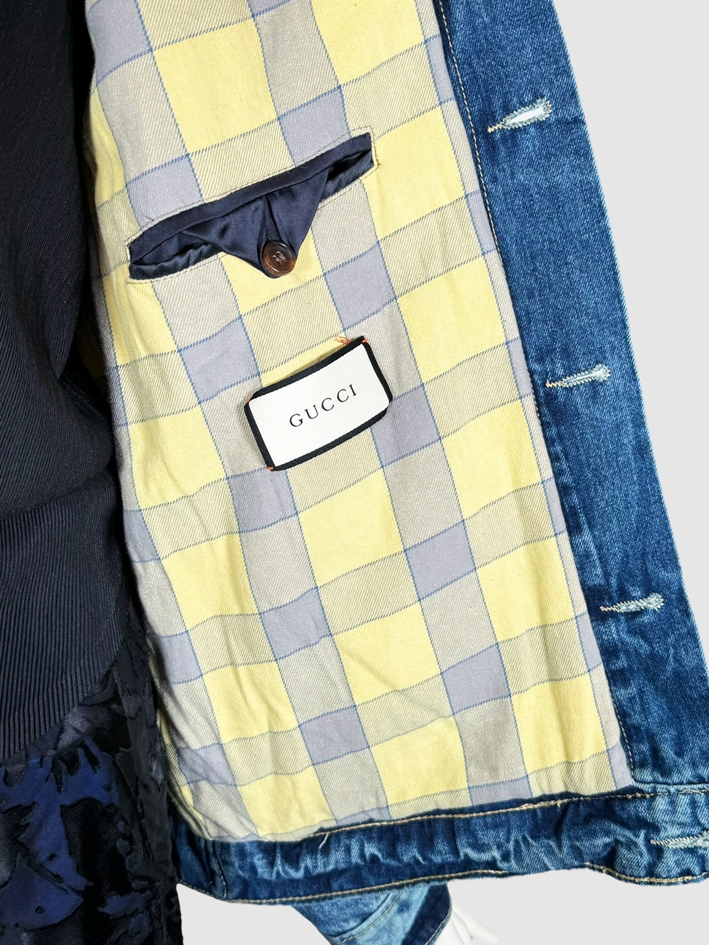 Gucci Blue Acid Wash New York Yankees Patch Denim Jacket with Yellow Plaid Interior, Size 46.
