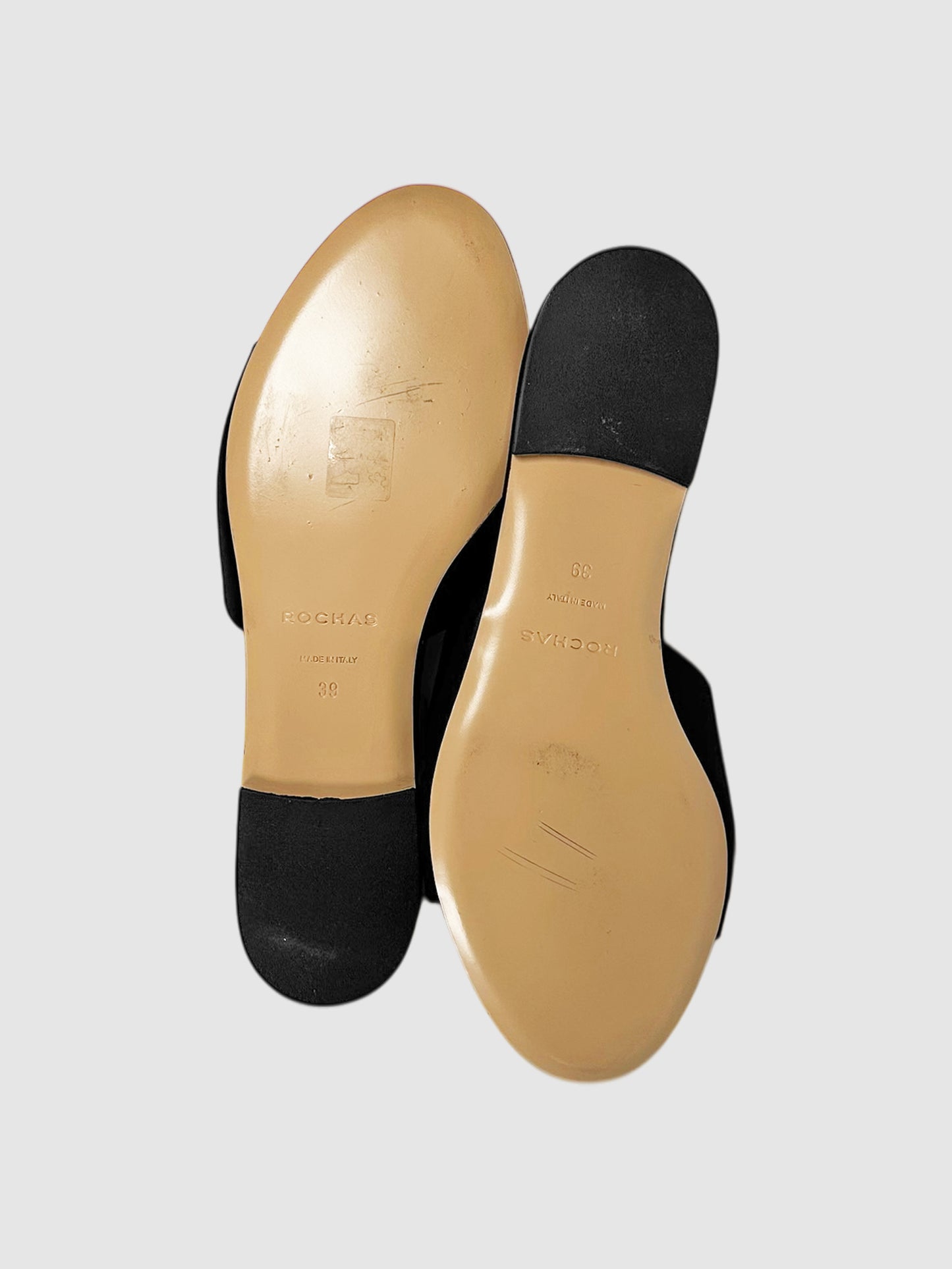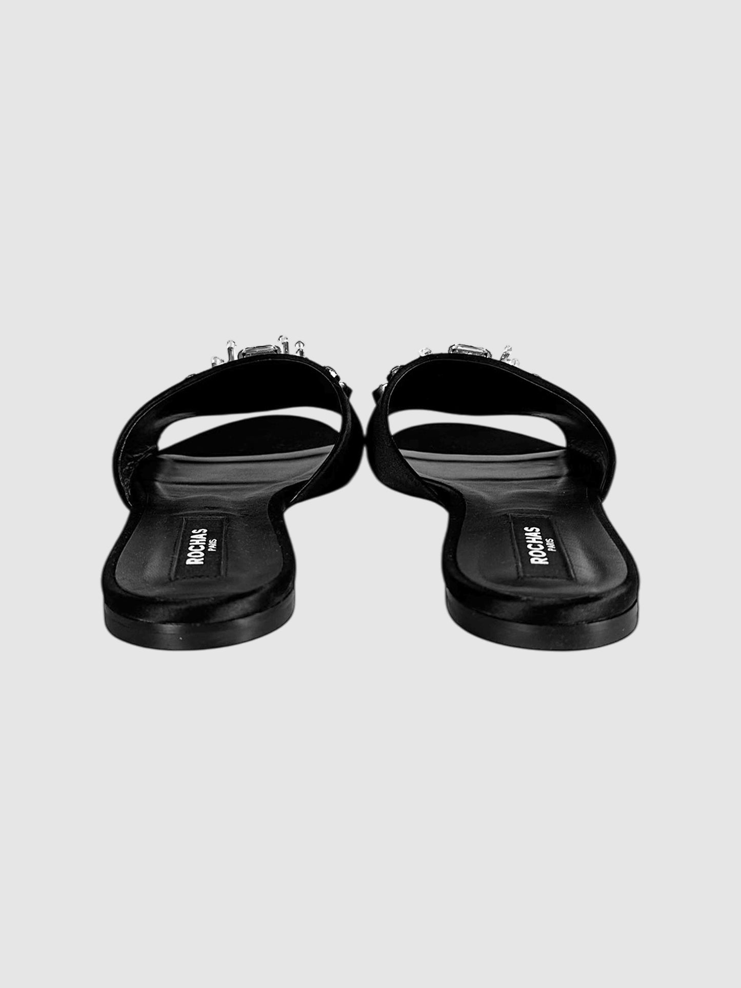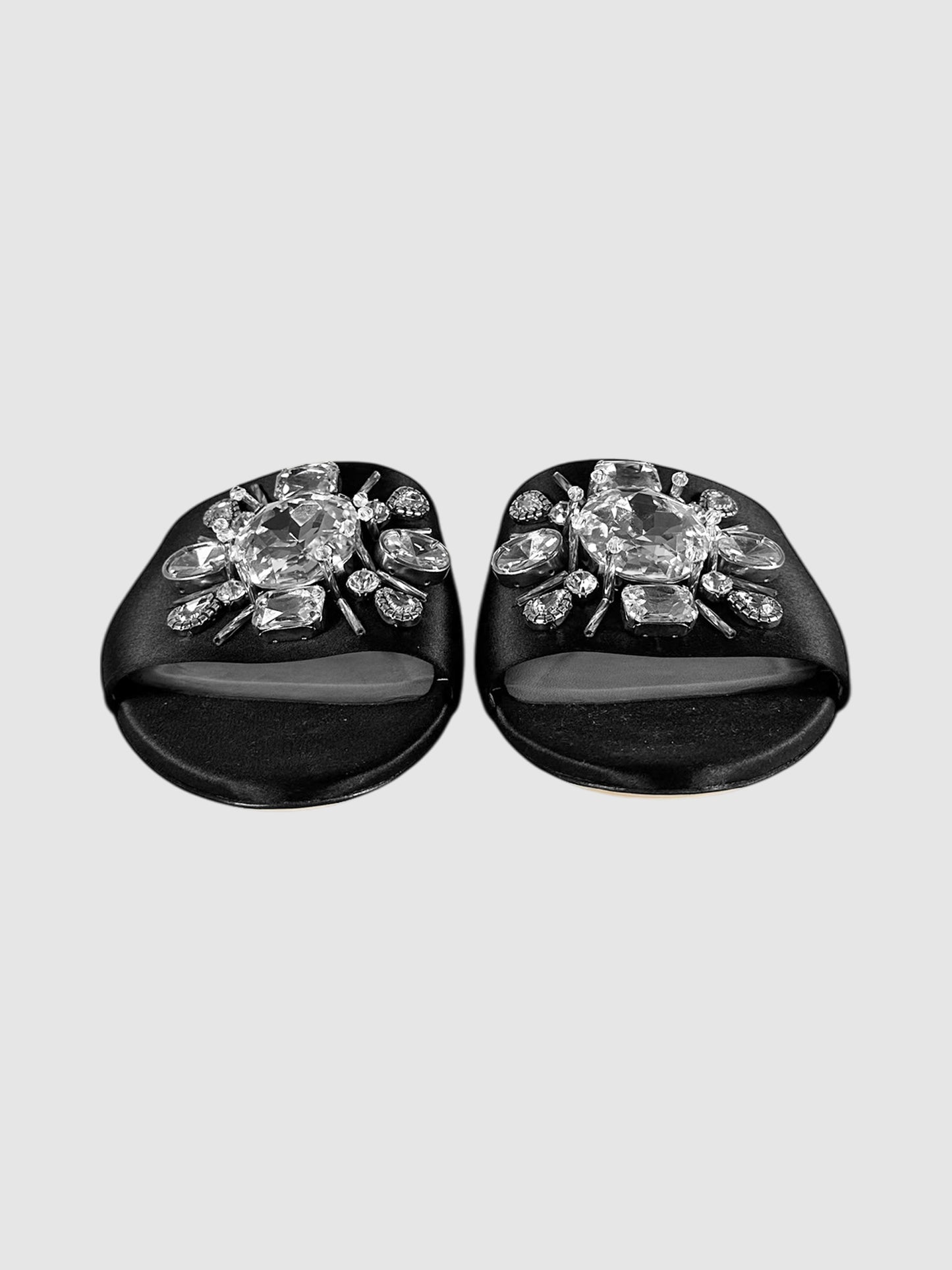 Rochas Black Satin Rhinestone-Embellished Slide-On Sandals - Size 39.