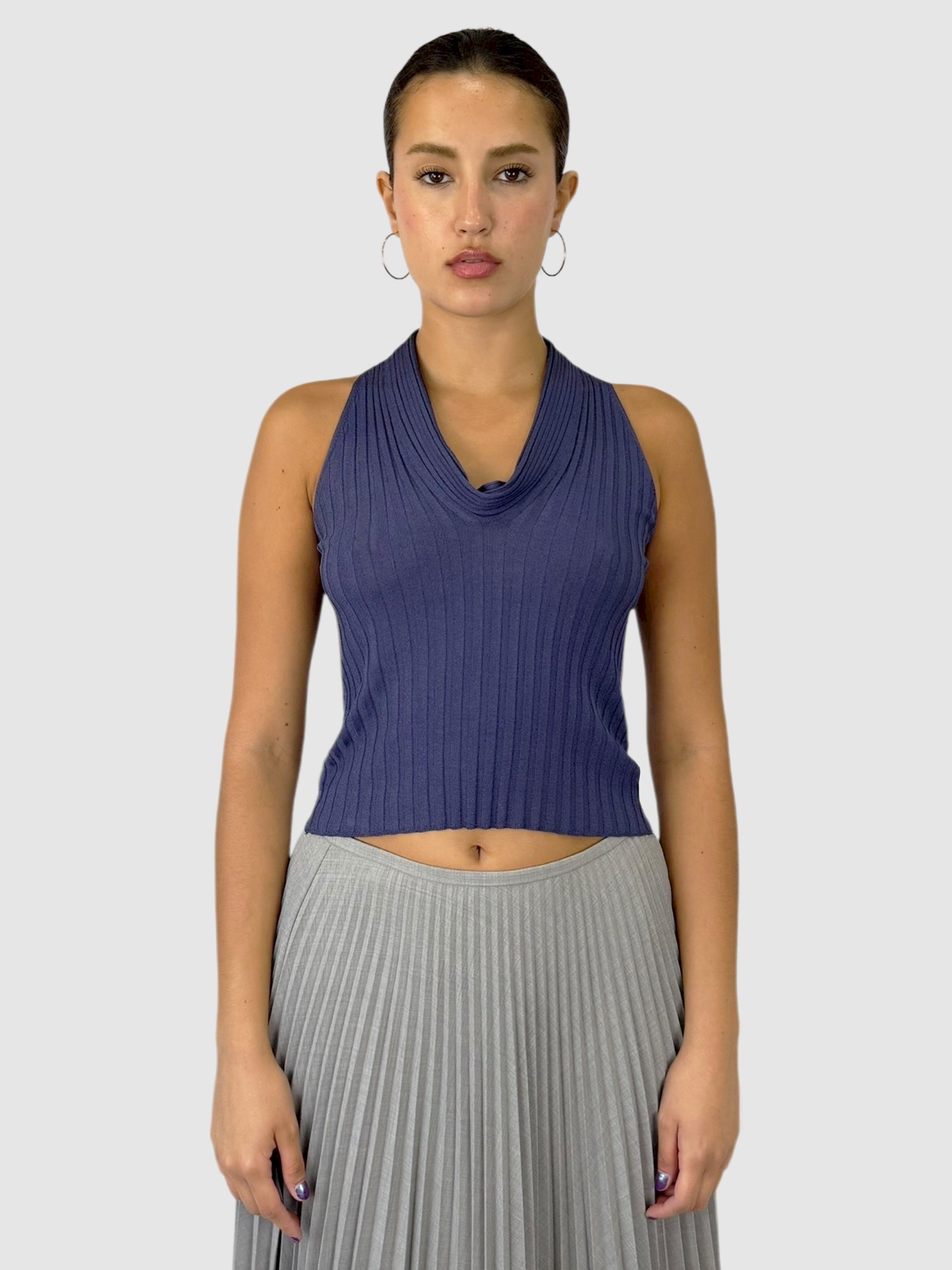 Brunello Cucinelli Indigo Blue Sleeveless Ribbed Cowl Neck Racerback Top, Size Small.