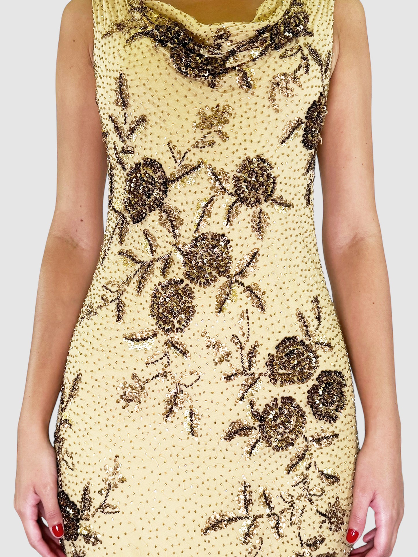 Roma High Class Beige and Bronze Strapless Cowl Neck Sequin Floral Print Low Back Maxi Dress, Size 40.