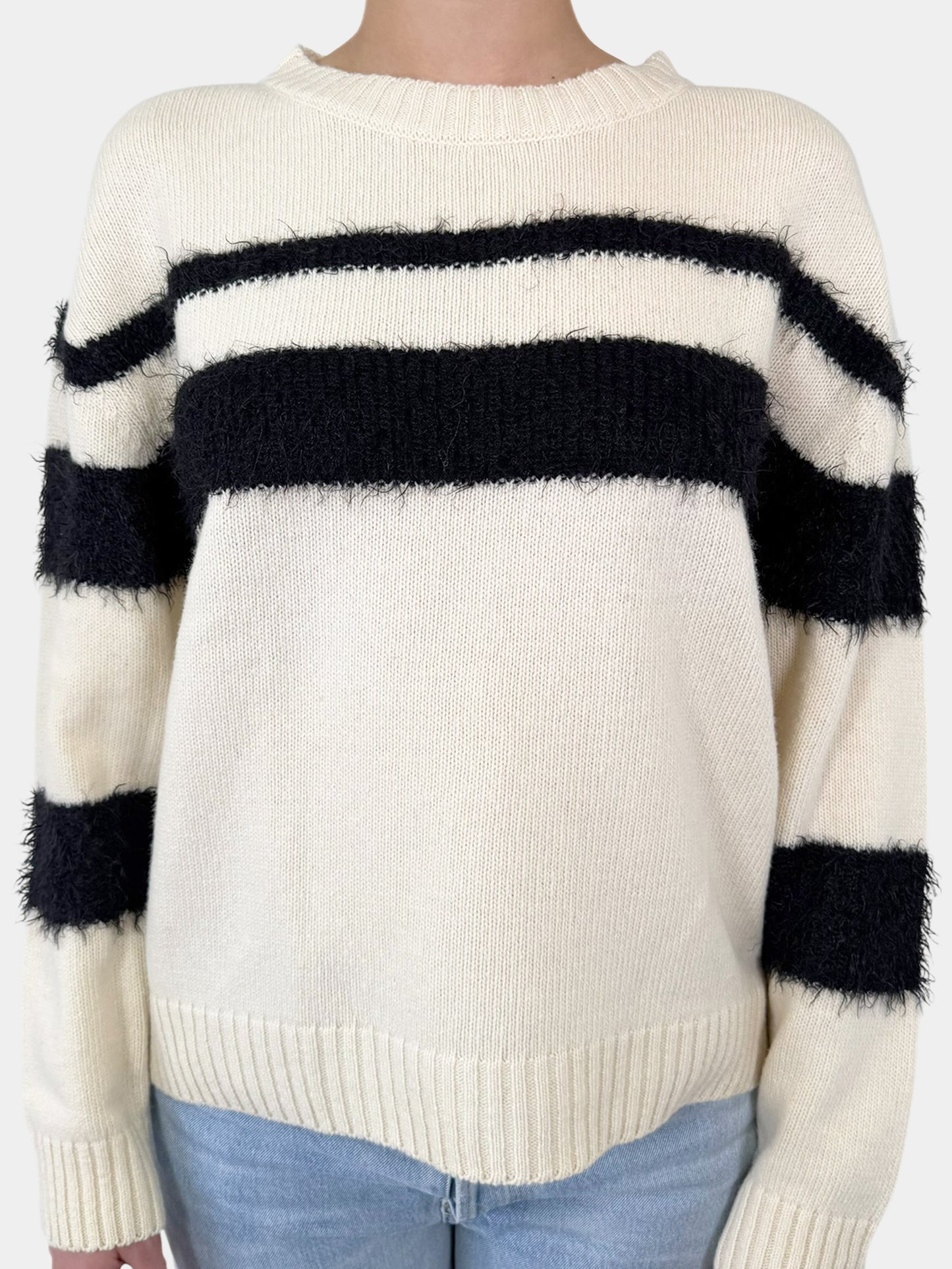 Anine Bing Cream and Black Striped Brushed Wool Blend Crewneck Sweater, Size Large.