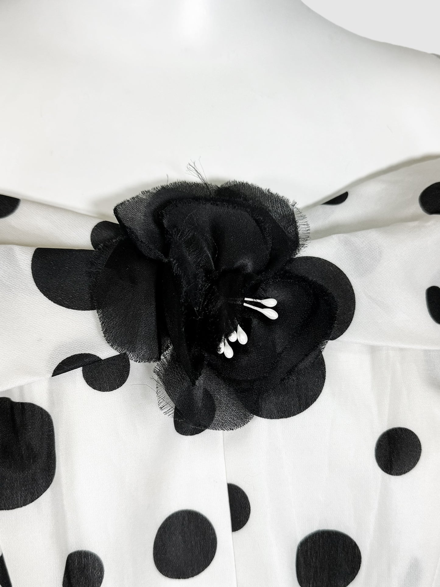 The Room White and Black Off-the-Shoulder Polka Dot Silk Top with Flower and Belt, Size 4.