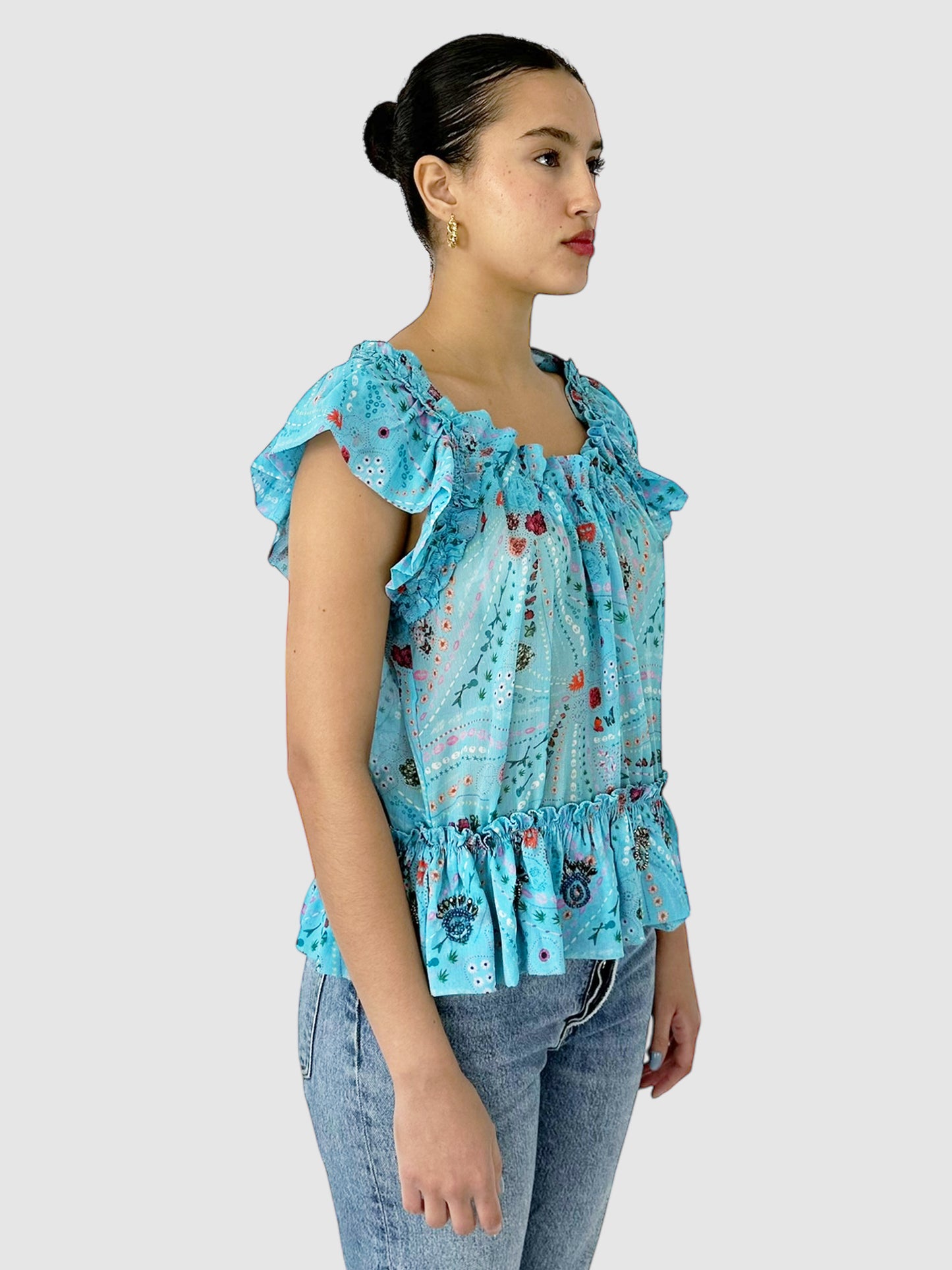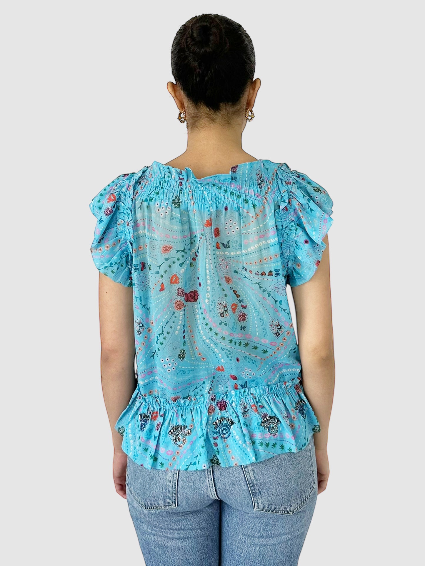 Zadig & Voltaire Blue Tutti Printed Psyche Ruffled Short Sleeve Top - Size Extra Small.