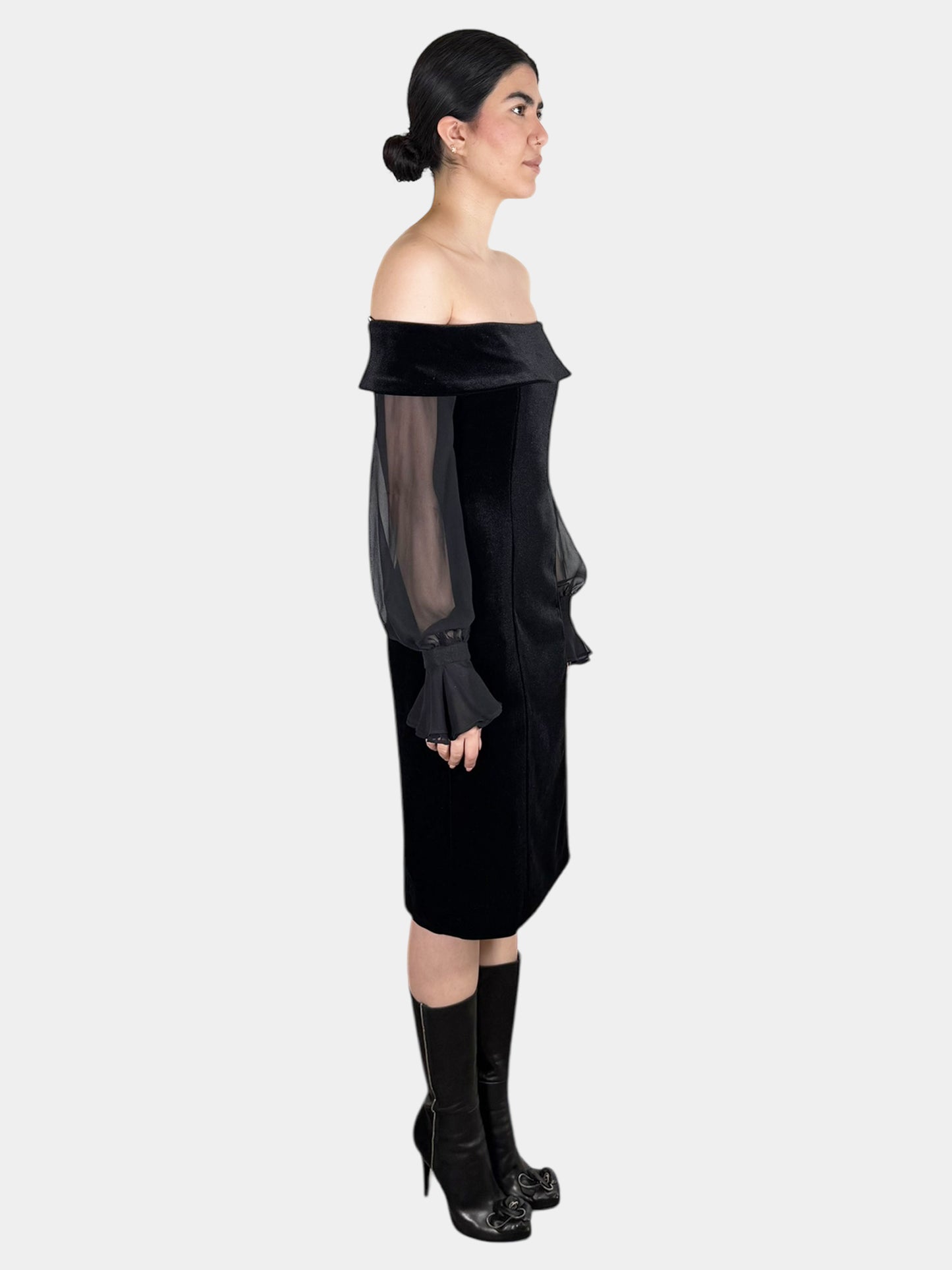Teri Jon Black Velour Off-the-Shoulder Knee-Length Dress with Sheer Bell Sleeves, Size Medium.