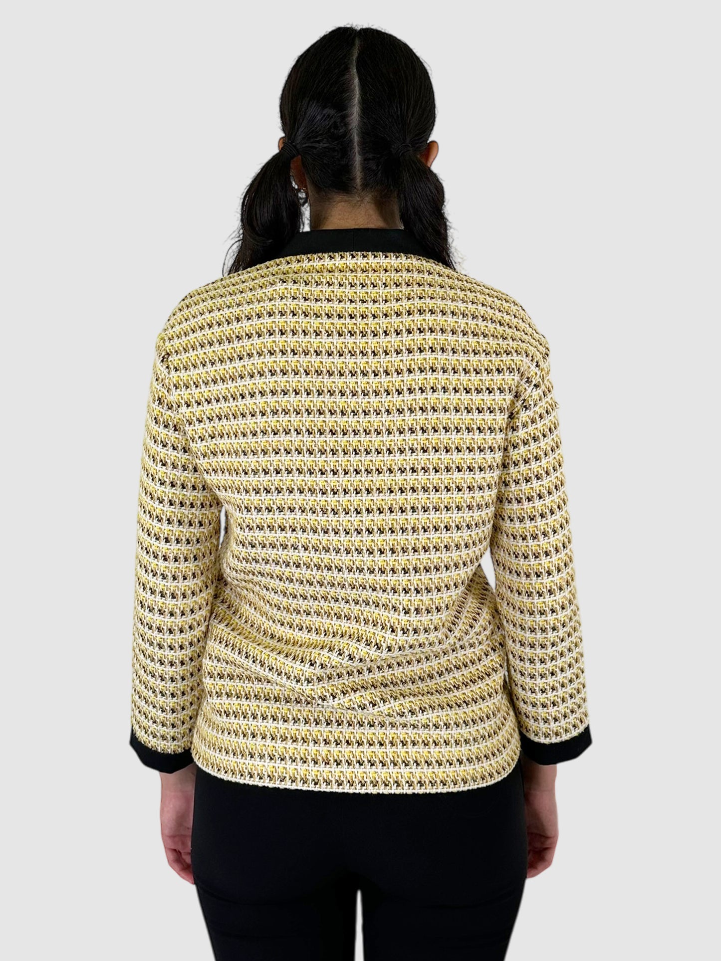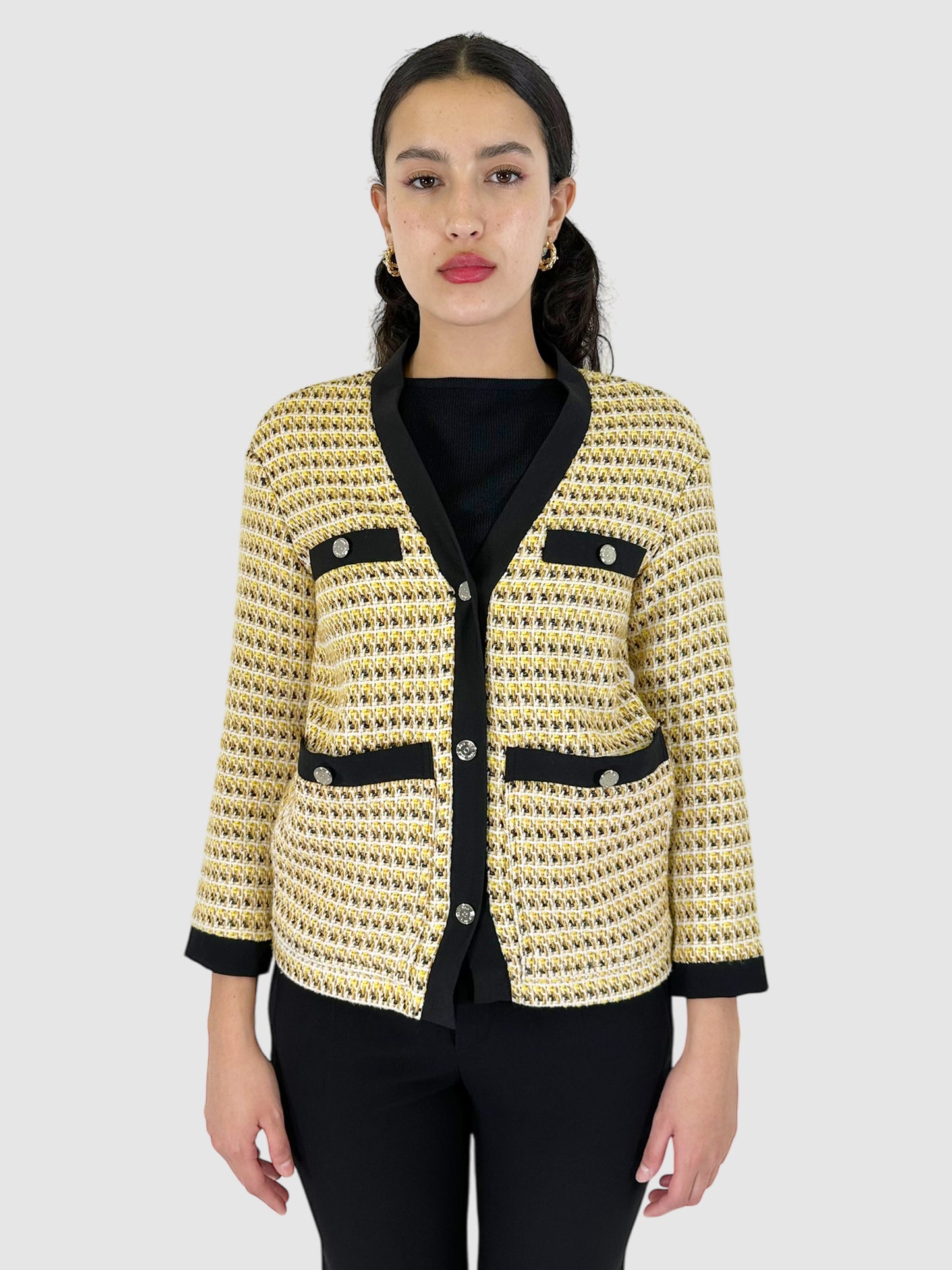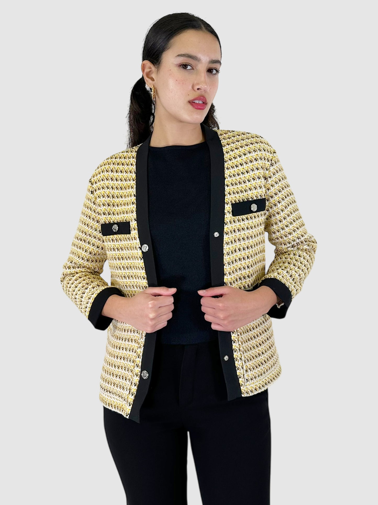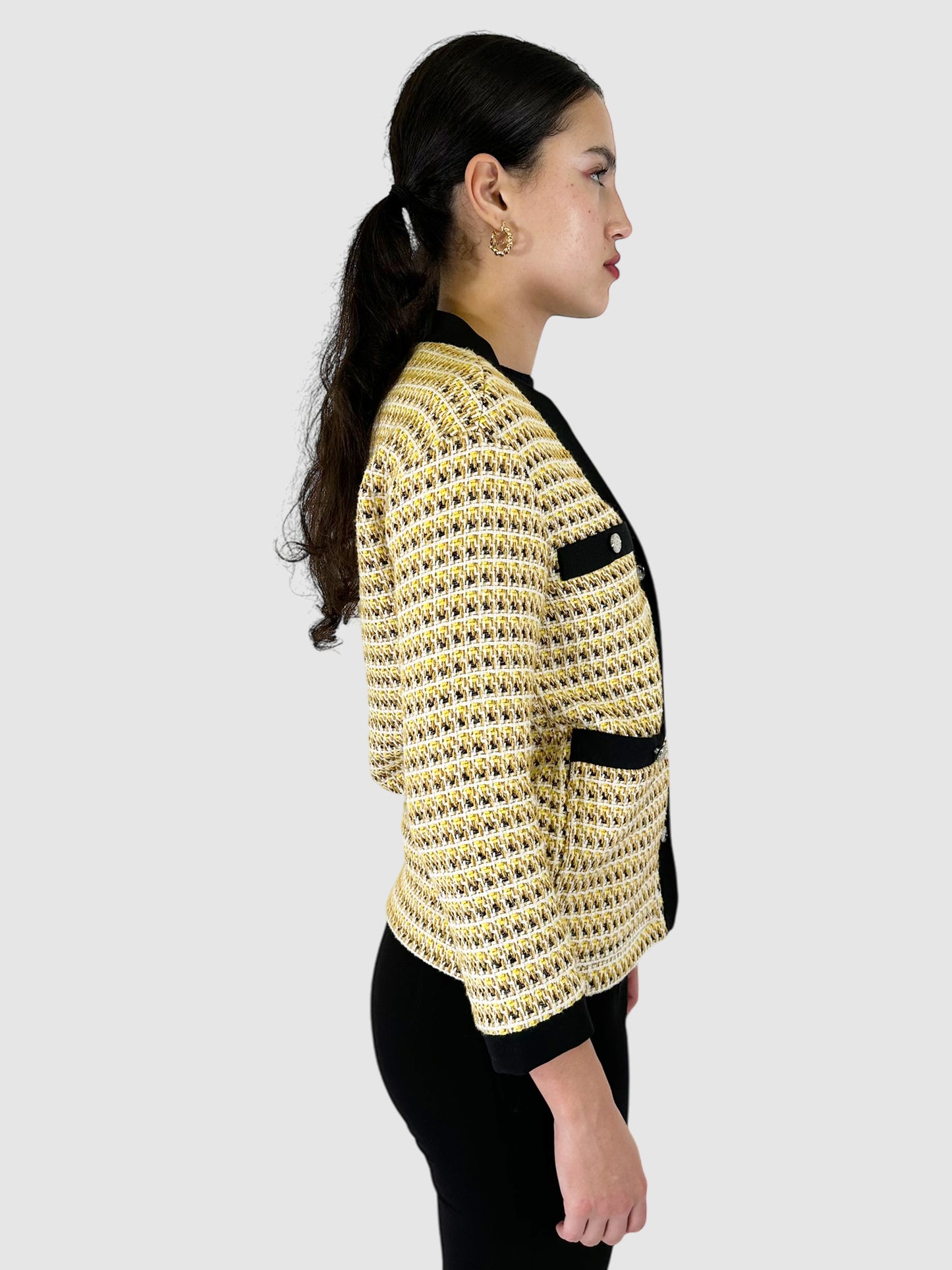 Maje Black, Yellow, Orange, White, and Gold-Tone Visidore Tweed Patterned Cardigan - Size 36.