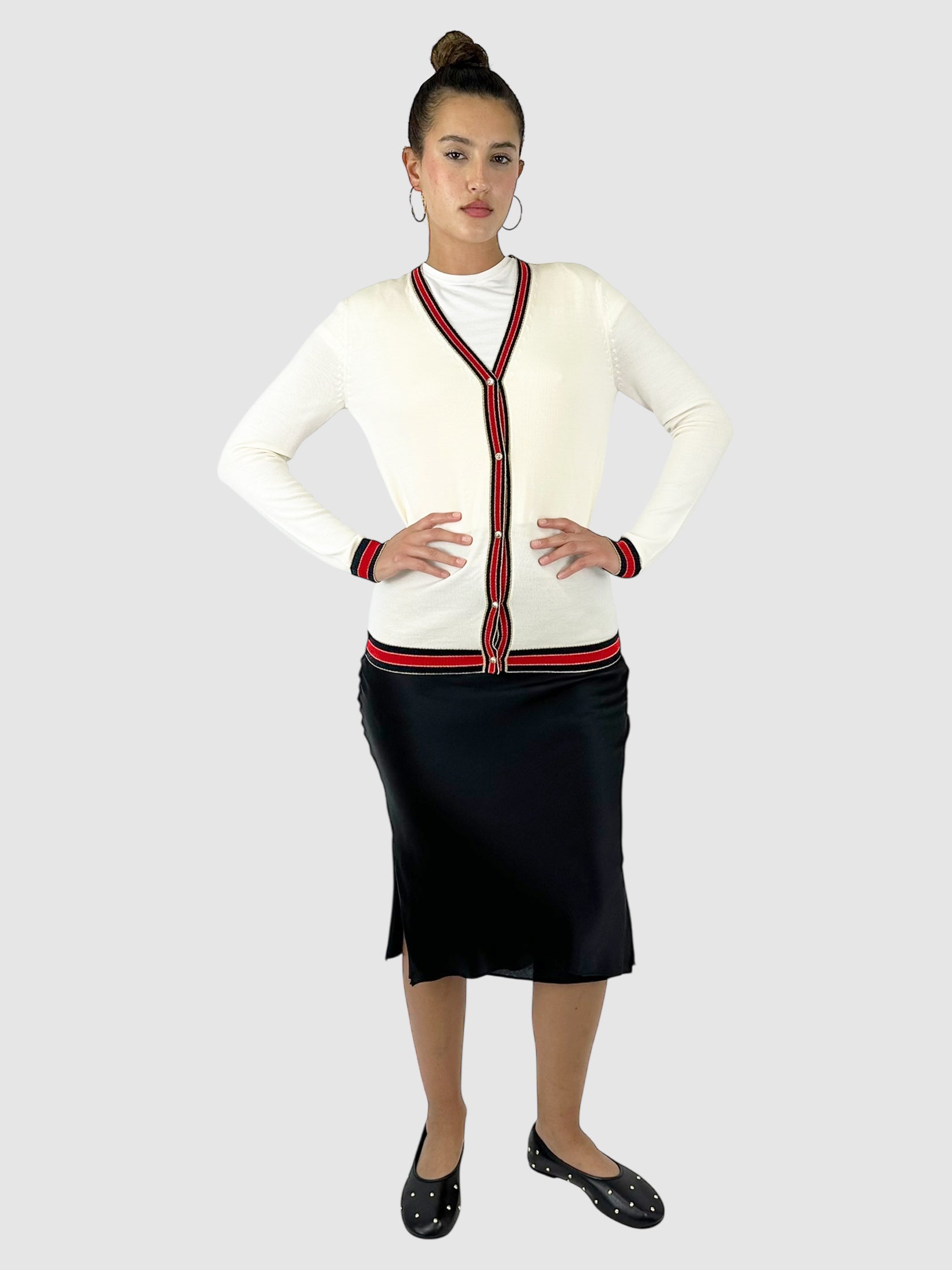 Gucci Cream, Red, and Black Web Stripe Button-Up Cardigan with Faux Pearl Buttons - Size Large.
