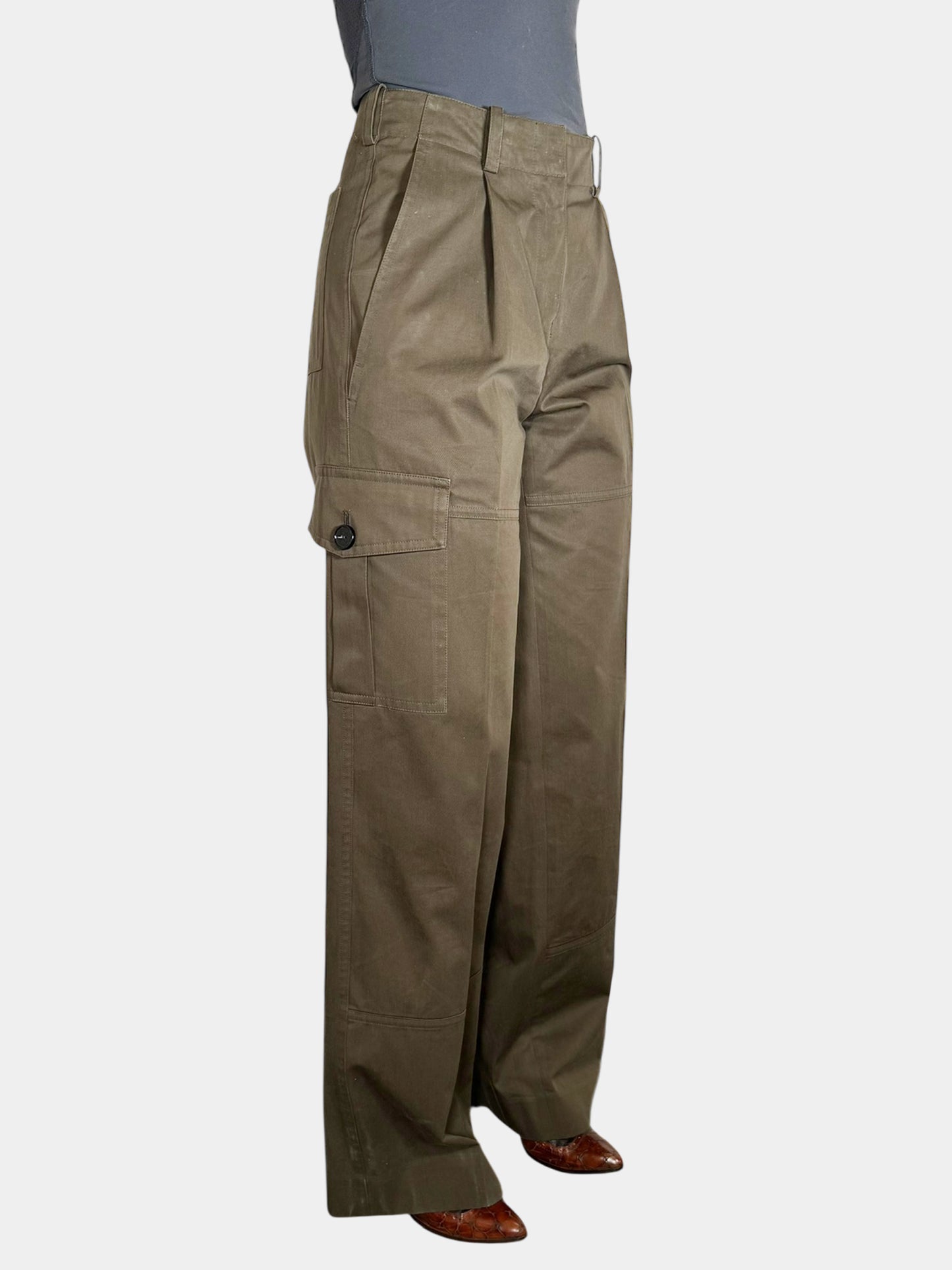 Nina Ricci Forest Green Khaki Wide Leg Cargo Pants, Size 34.