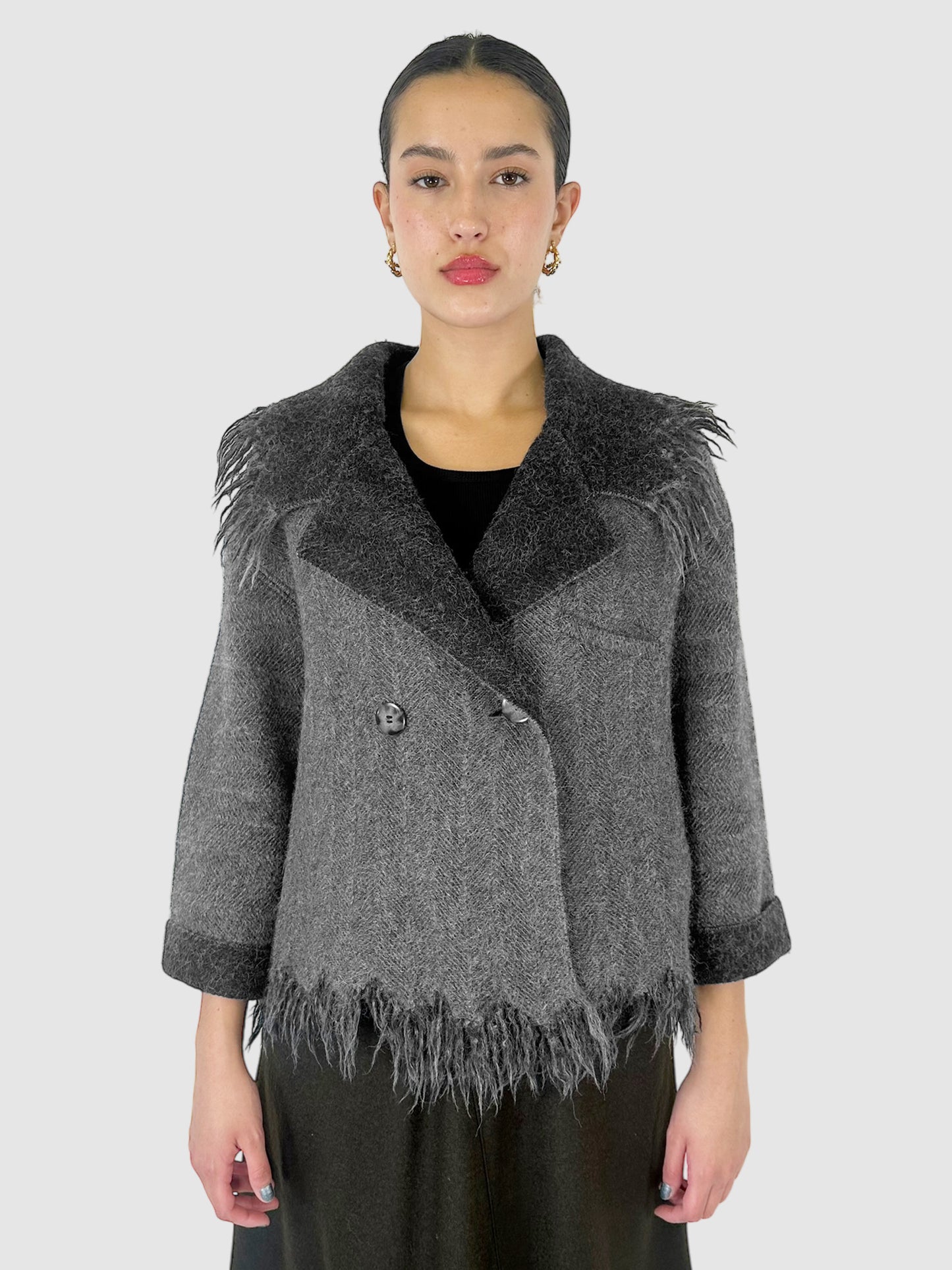 Wool Fringe Trim Double-Breasted Coat - Size M