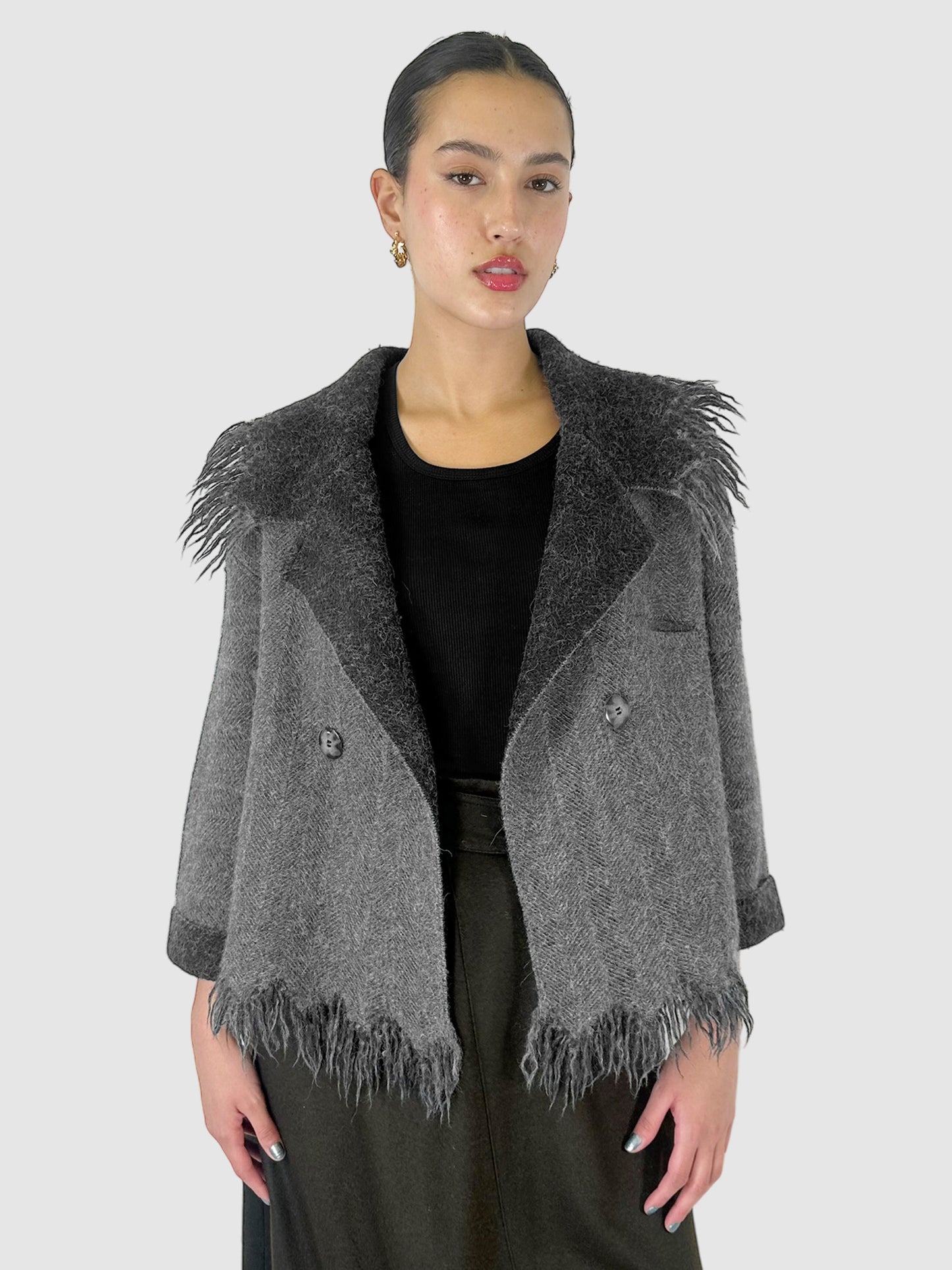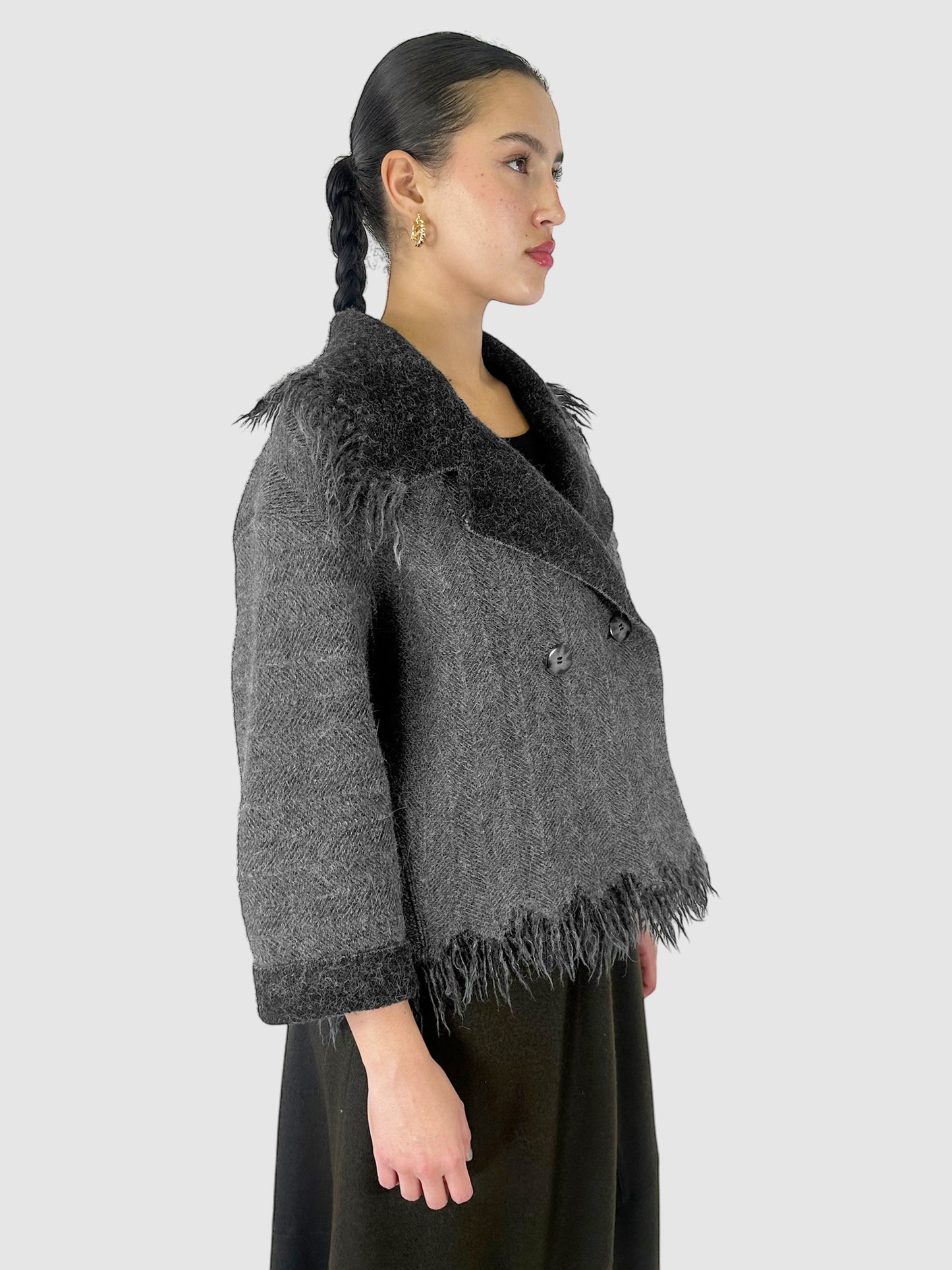 Issey Miyake Grey Wool Double-Breasted Coat with Fringe Trim - Size Medium.