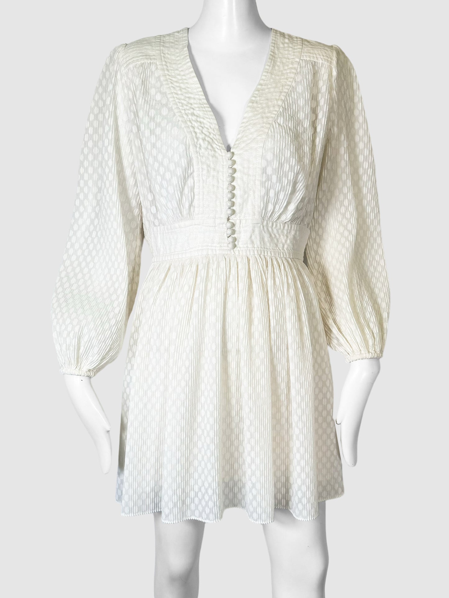 Zimmermann Off-White Plissé Polka Dot V-Neck Mini Dress, Size 3.