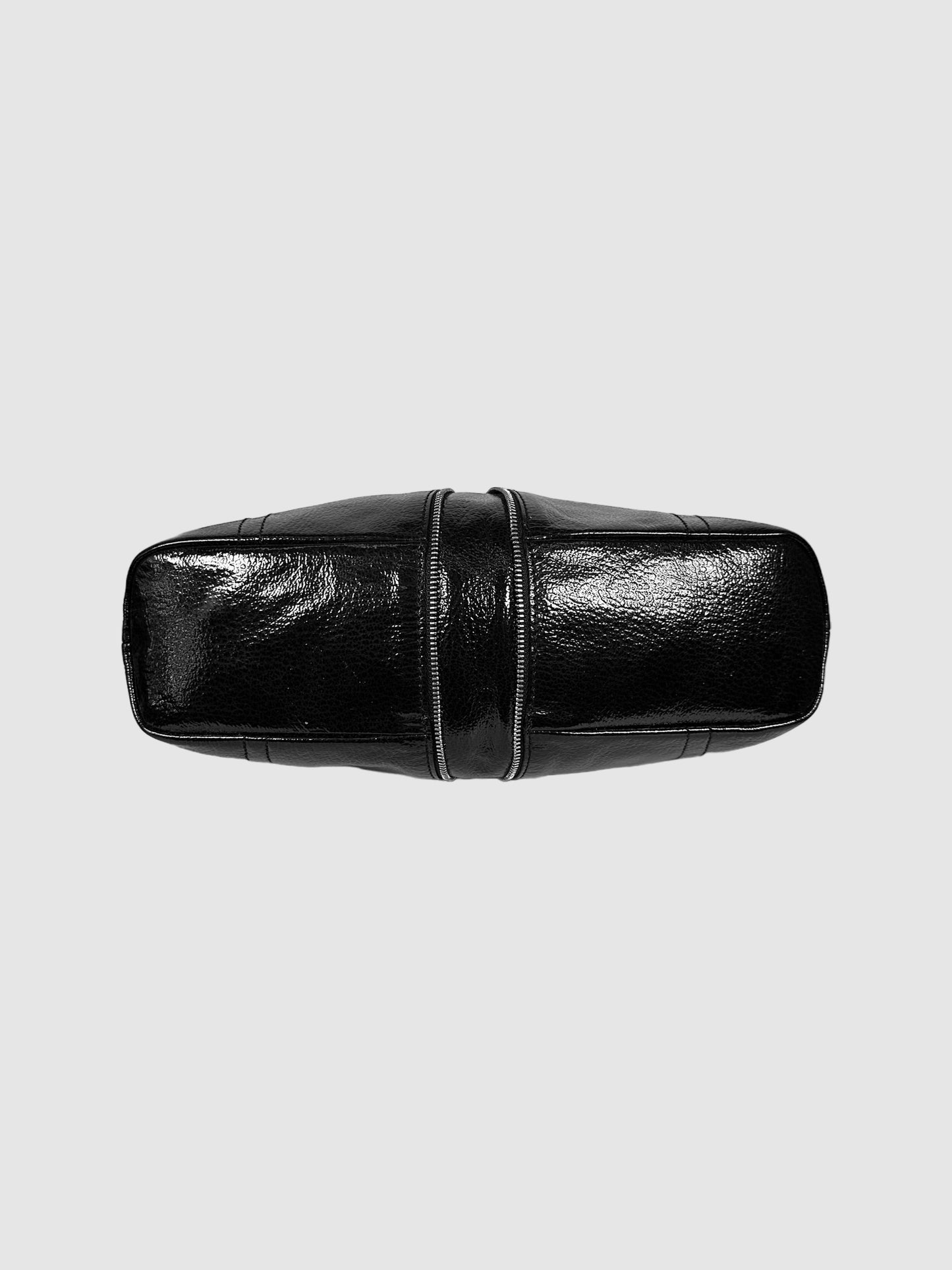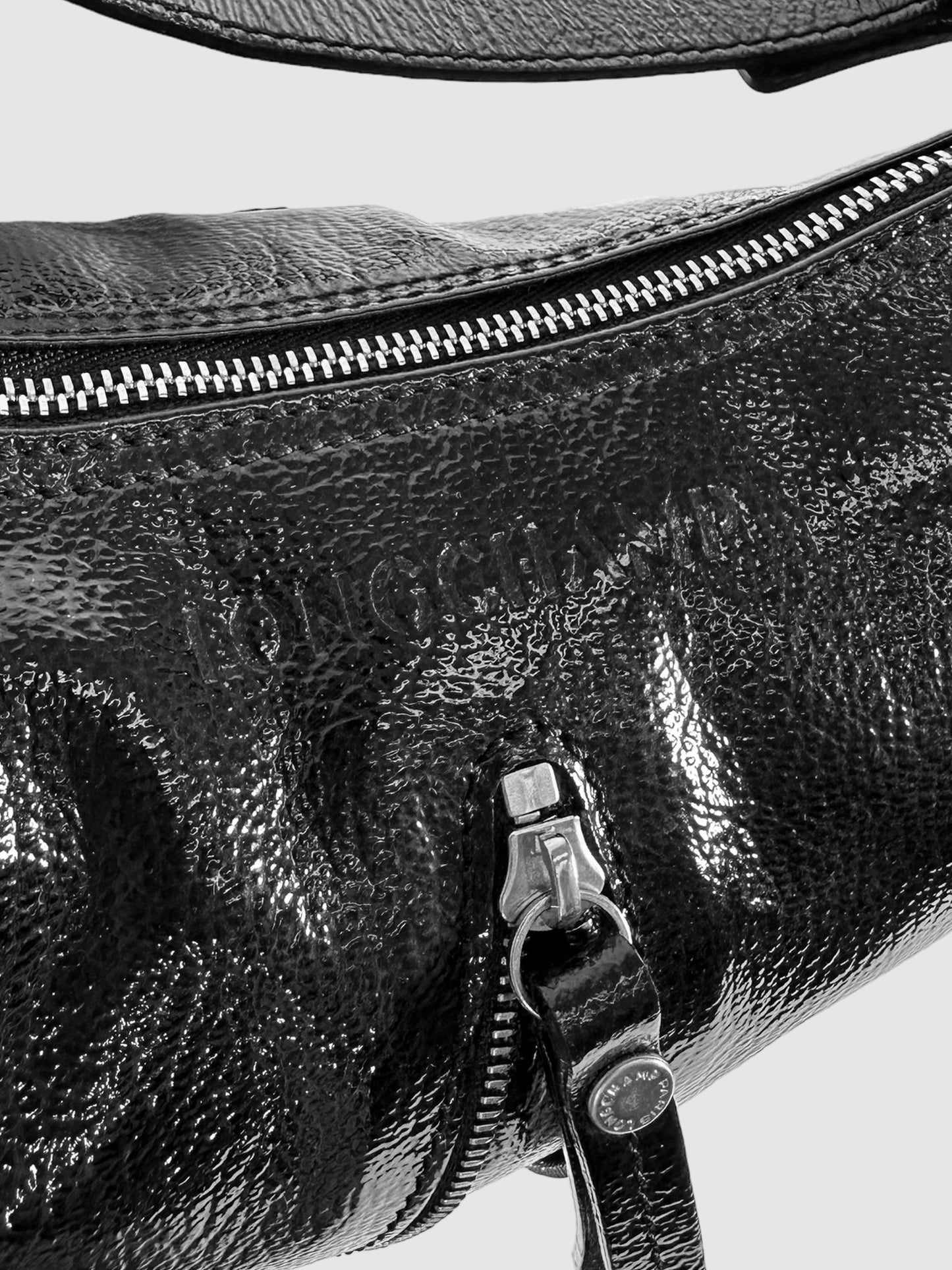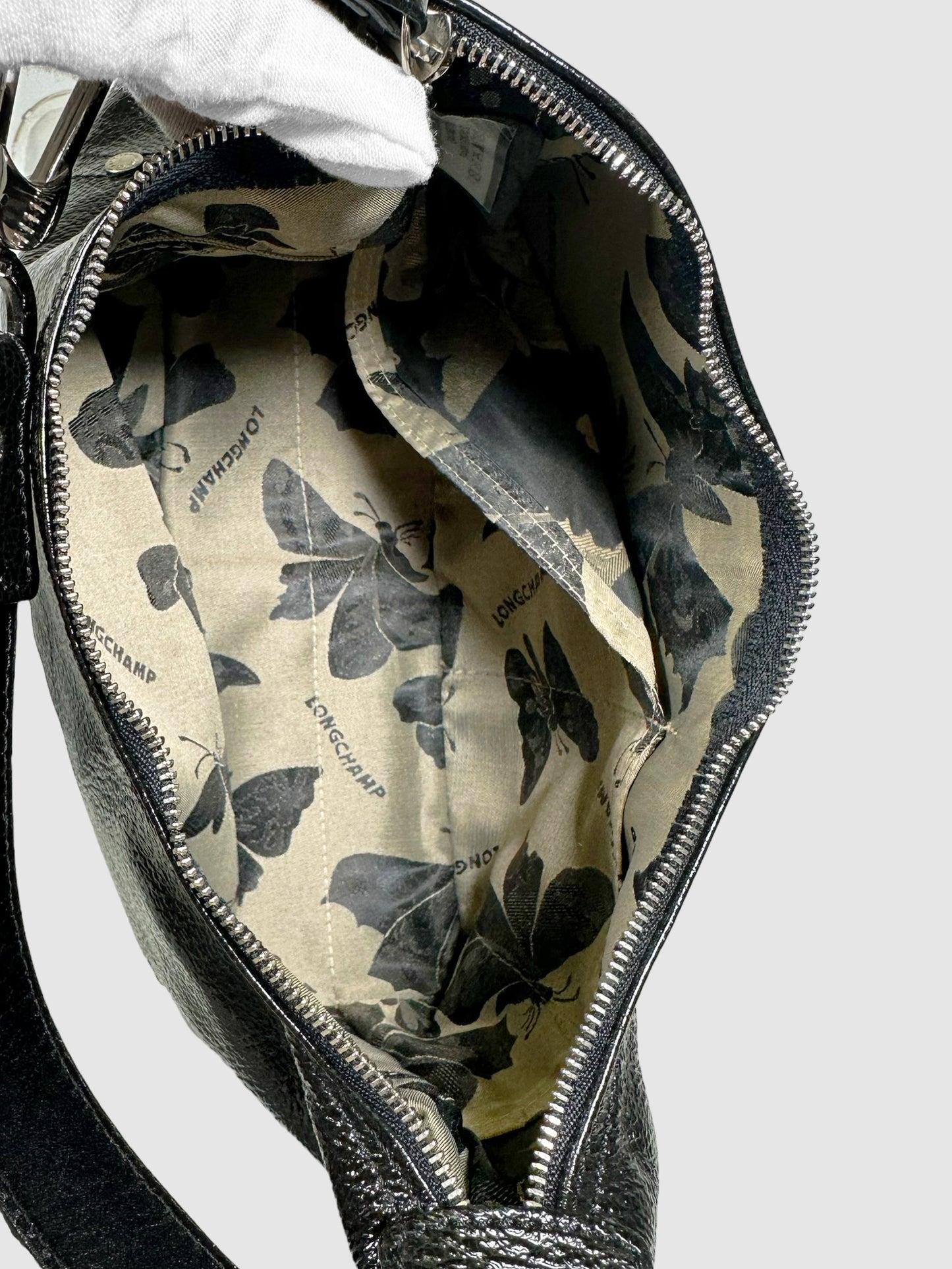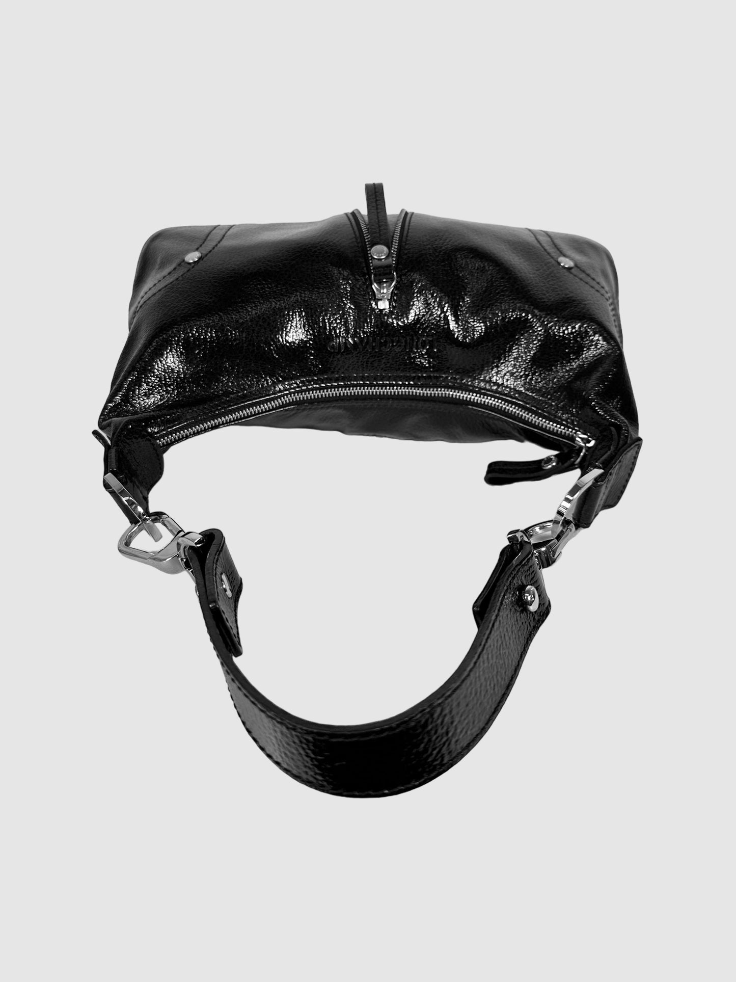 Longchamp Black Leather Pebbled Patent Leather Baguette Hand Bag with Zipper Accent.