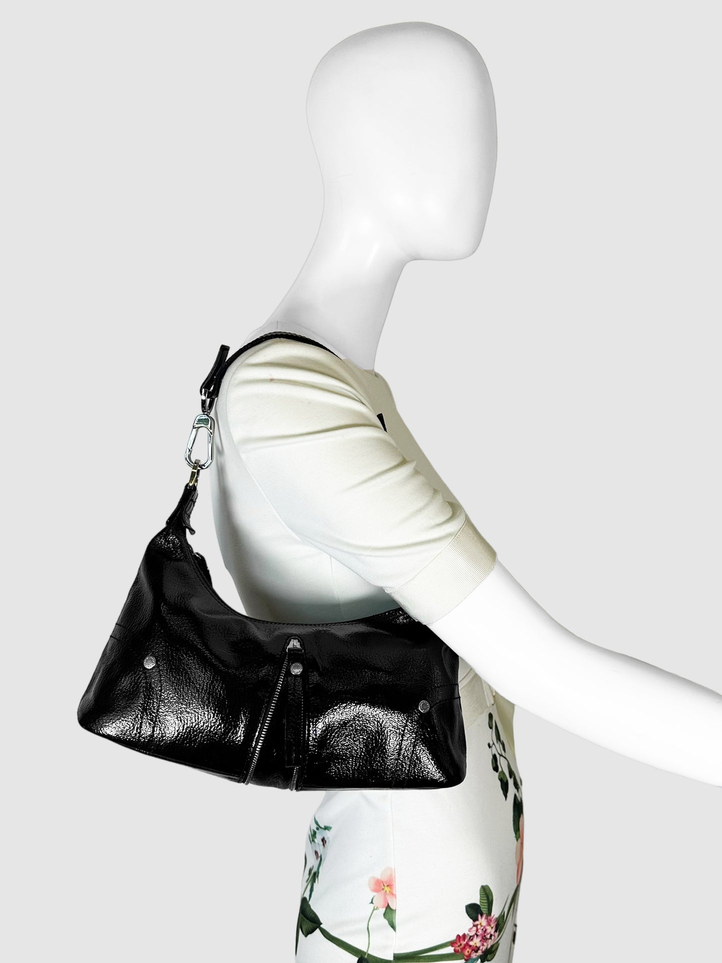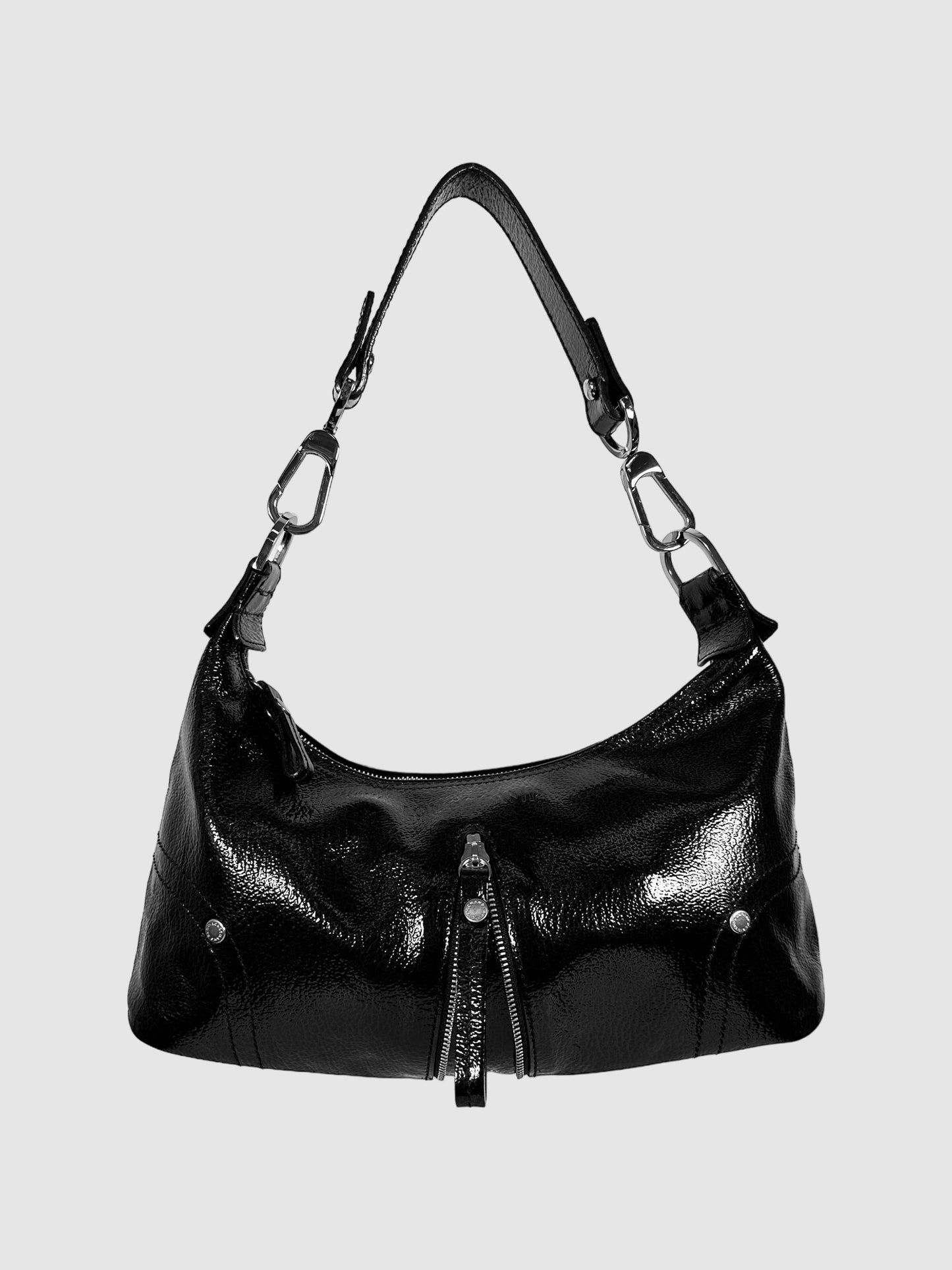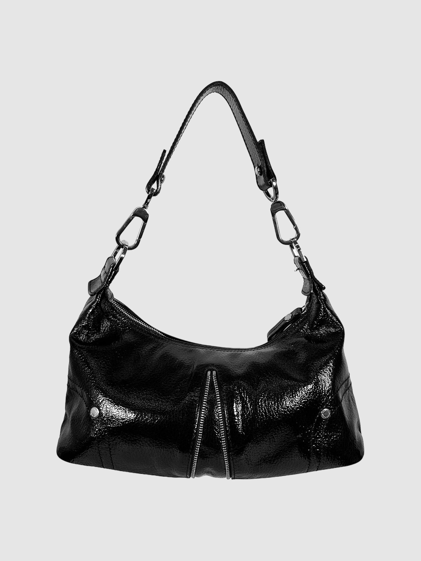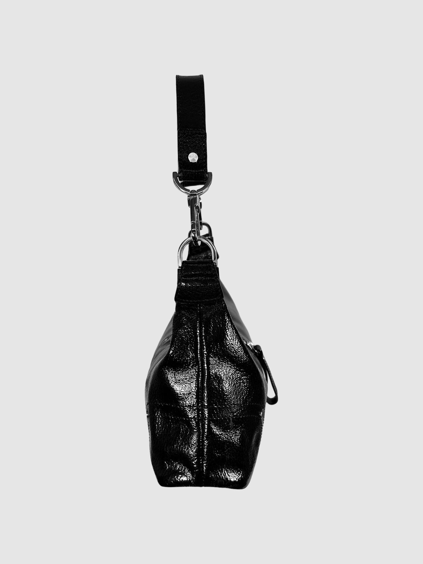Longchamp Black Leather Pebbled Patent Leather Baguette Hand Bag with Zipper Accent.